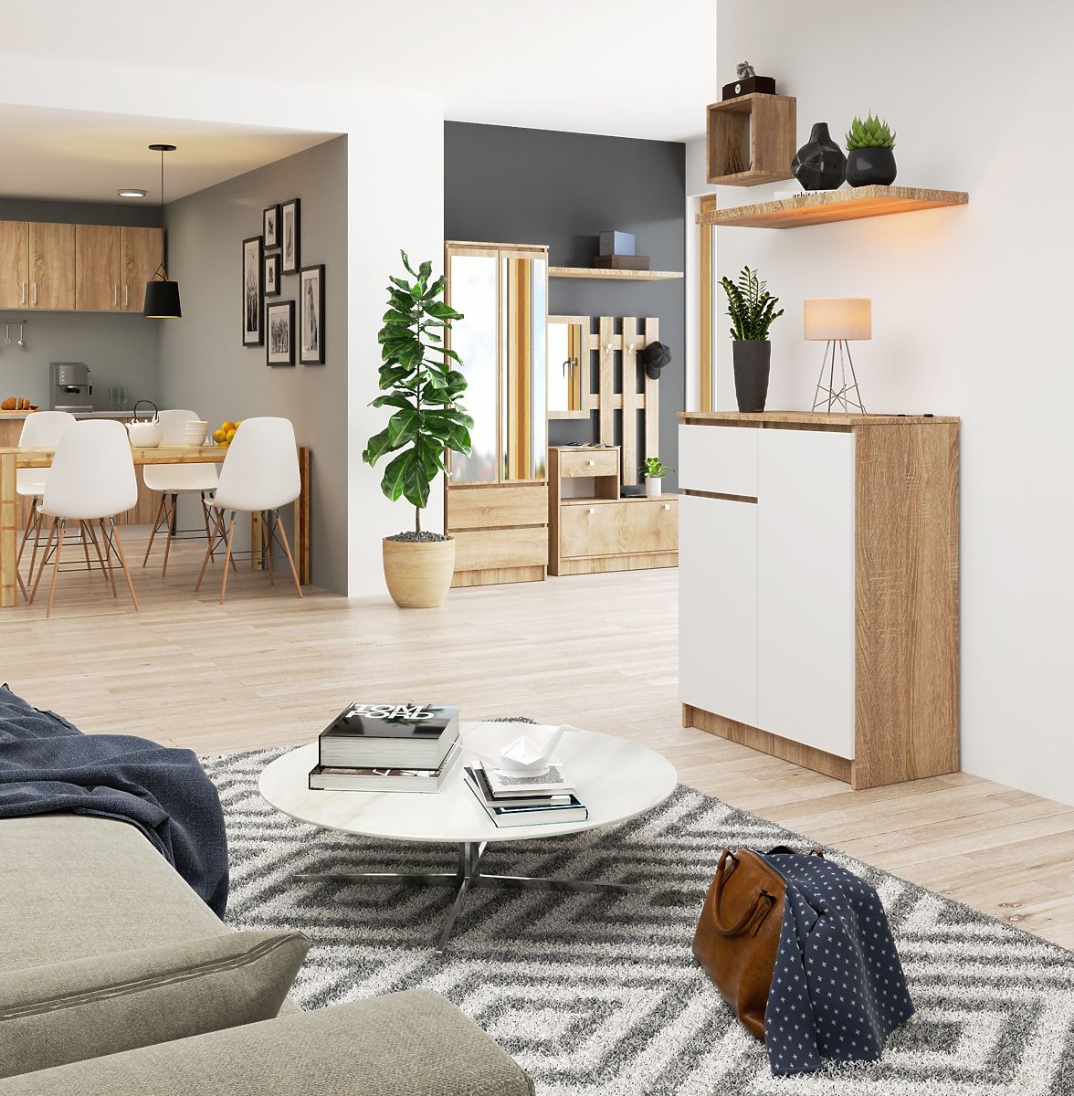 Malá komoda je prvok vybavenia, ktorý nájde uplatnenie v každej miestnosti. Svetlé farby, pevná konštrukcia a precízne spracovanie viedli k vytvoreniu skrinky, ktorá sa hodí napríklad do predsiene, obývacej alebo detskej izby, ale aj do spálne. Môže byť využitá aj v kancelárii, kde umožní ukladanie mnohých dokumentov a ďalších kancelárskych potrieb. Komoda sa skladá z dvoch uzatvárateľných skriniek (v každej z nich sú dve police) a zásuvky. Nábytok kombinuje módne farebnosti - bielu a dub sonoma.
