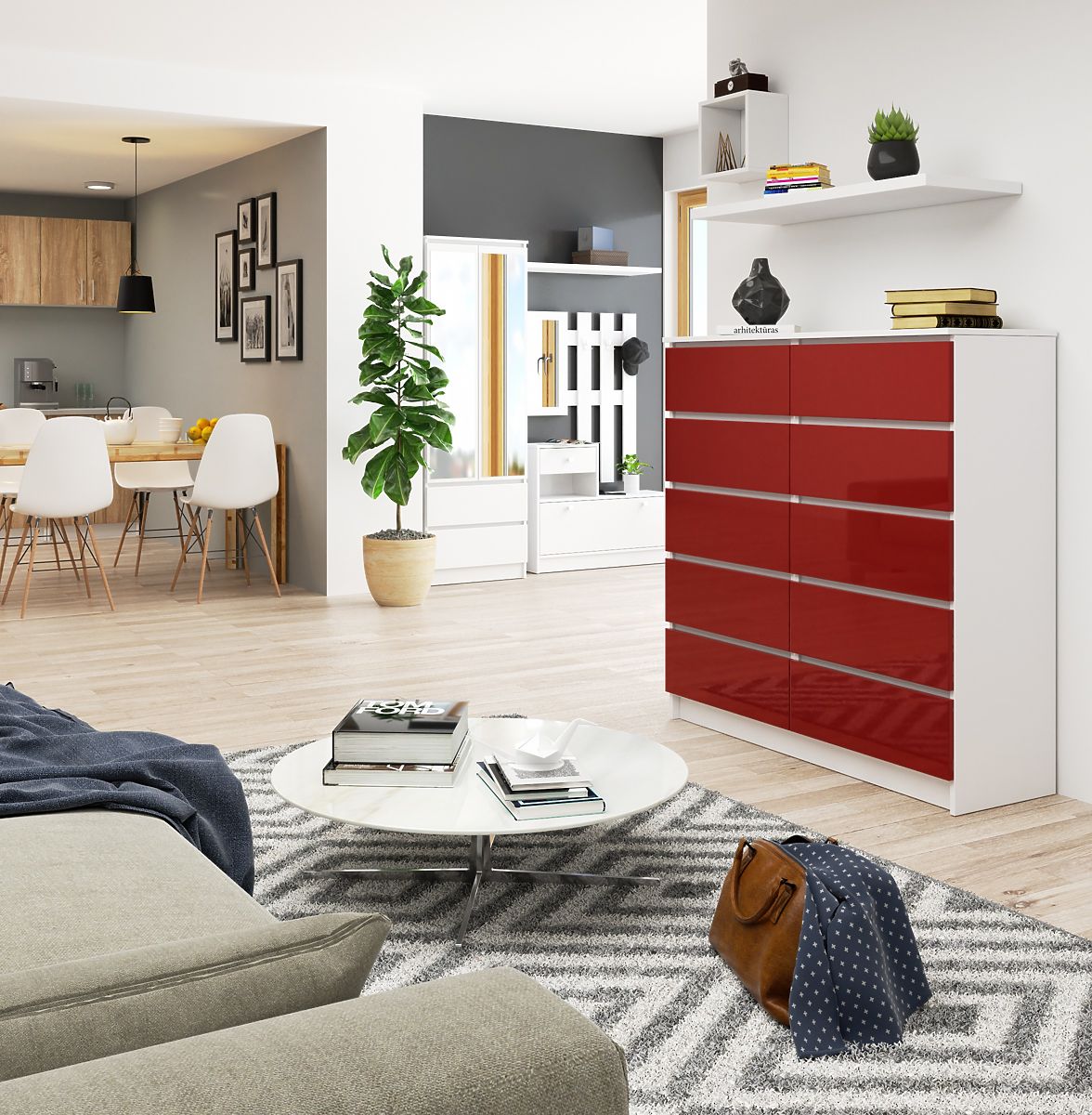 Komoda, model K je nábytok s výraznou, energetickou farbou. Hlboká červená čelá s lesklým povrchom a biely matný korpus vyzerajú veľmi zaujímavo. Dojem umocňuje lesklá štruktúra, ktorá odráža svetlo a vytvára na povrchu nábytku efektné odlesky.
