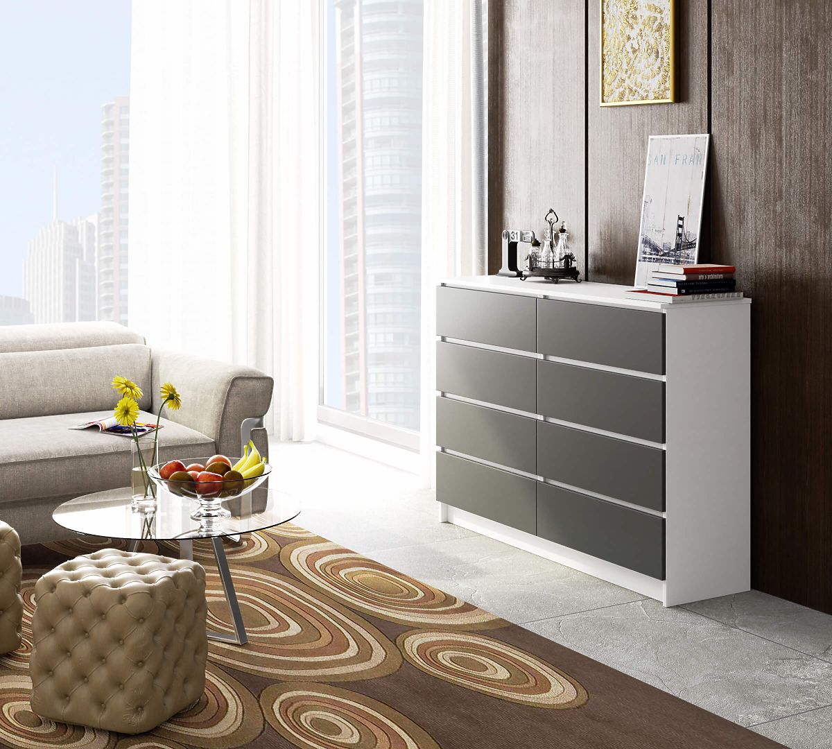 Komoda s ôsmimi zásuvkami v bielej a šedej farbe. .. viac