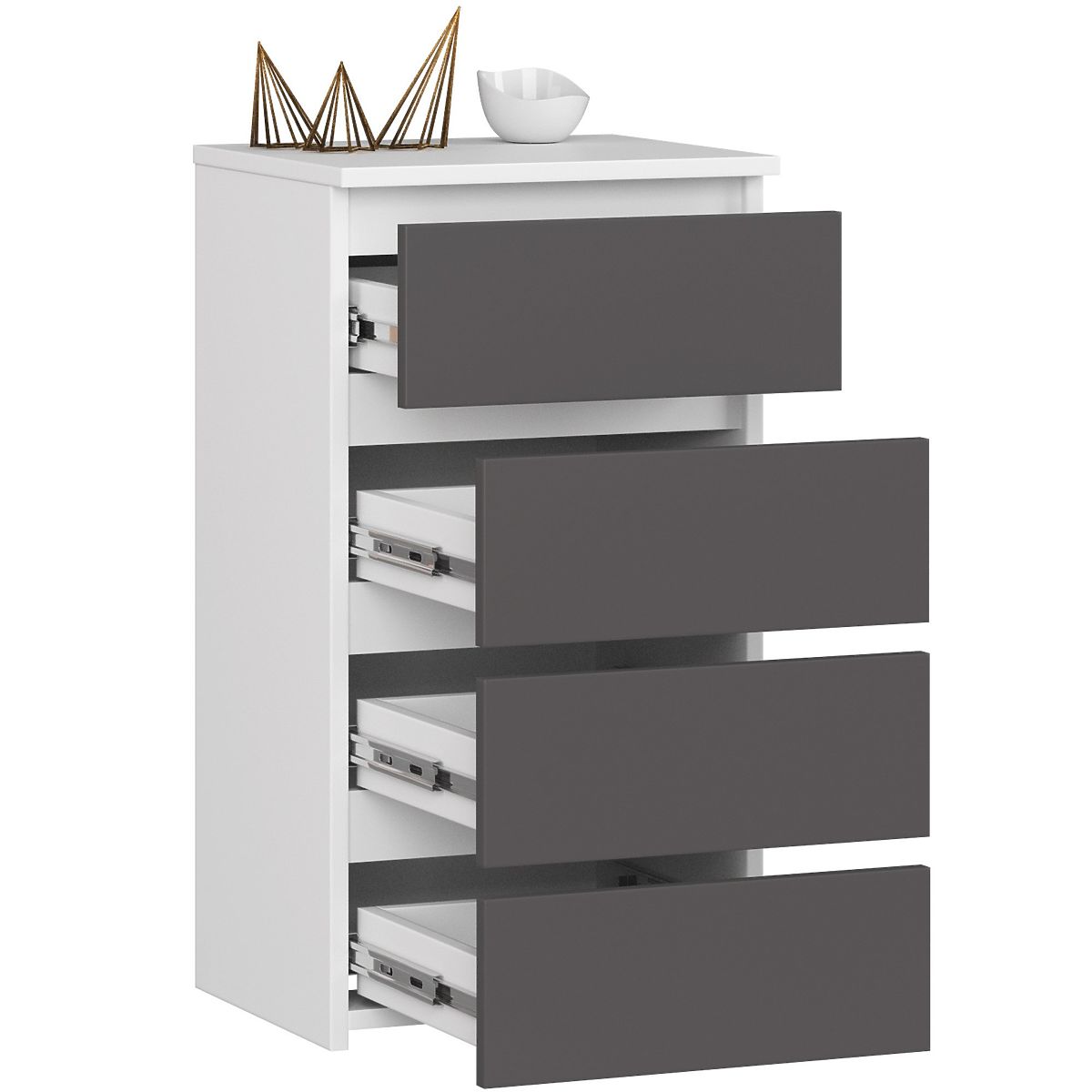 Komody sú obľúbeným typom nábytku, ktorý sa umiestňuje vedľa postele. Na jeho doske sa najčastejšie nachádza lampička, zatiaľ čo vo vnútri sú predmety uľahčujúce odpočinok a spánok. Osoby, ktoré hľadajú elegantnú komodu, by mali venovať pozornosť komode CL4 40 cm v farbe grafitovo šedá s bielymi čelami. Bude sa krásne vynímať v každej spálni. Možno ju tiež umiestniť do detskej izby.