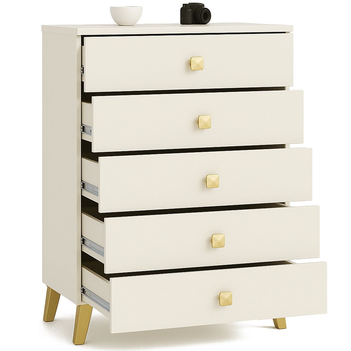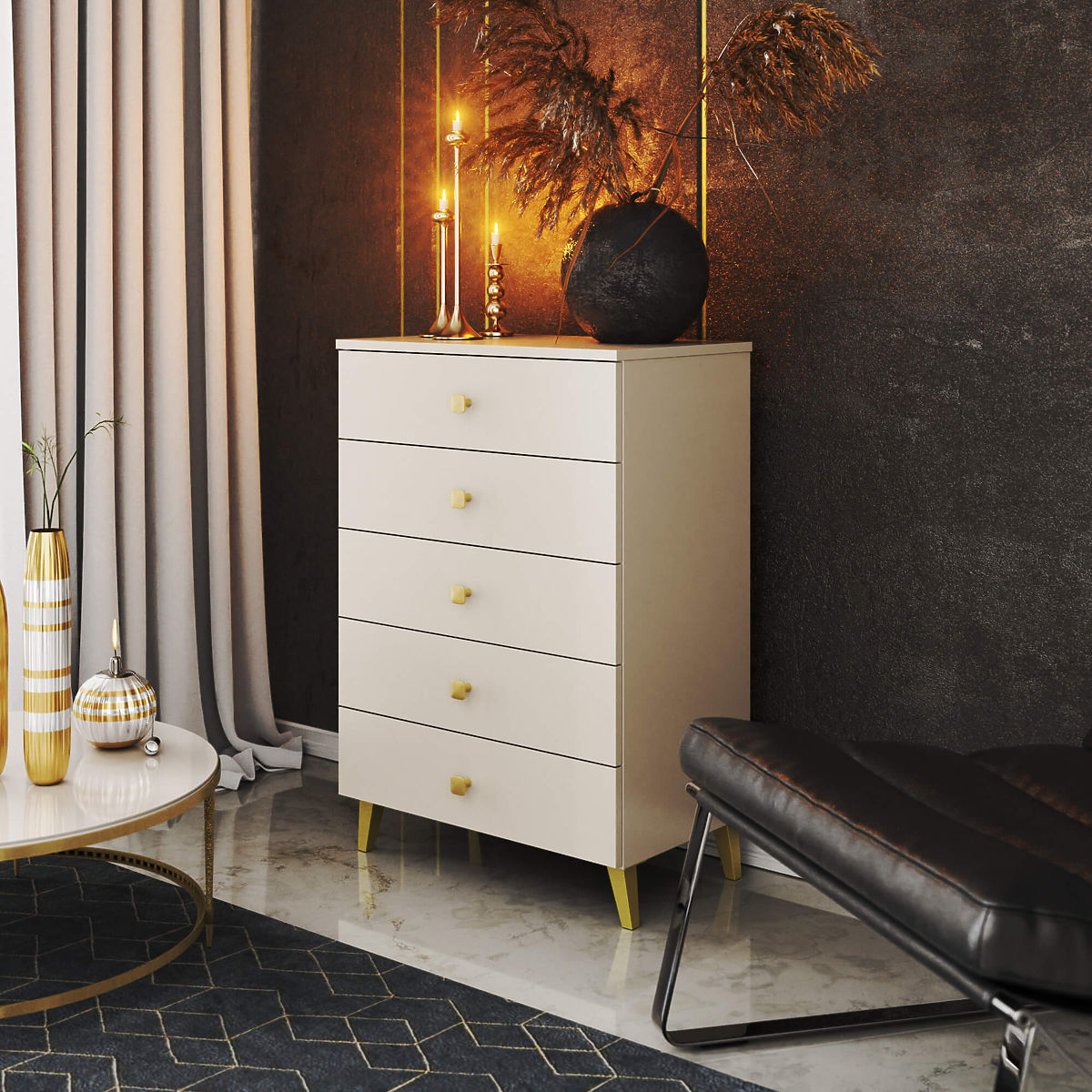 Malá komoda je prvok vybavenia, ktorý nájde uplatnenie v každej miestnosti. Moderné farby, pevná konštrukcia a precízne spracovanie viedli k vzniku skrinky, ktorá sa hodí napríklad do predsiene, obývacej alebo detskej izby, ale aj do spálne. Môže byť využitá aj v kancelárskych priestoroch, kde umožní ukladanie početných dokumentov a ďalších kancelárskych potrieb. Komoda sa skladá z 5 zásuviek. Nábytok kombinuje farby kašmíru a zlata.