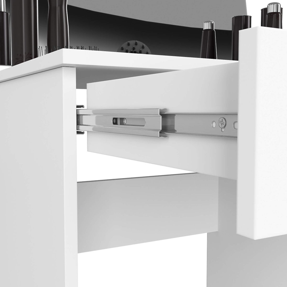 Toaletný stolík so zrkadlom v bielom odtieni so zásuvkami a priestranným miestom za dvierkami.