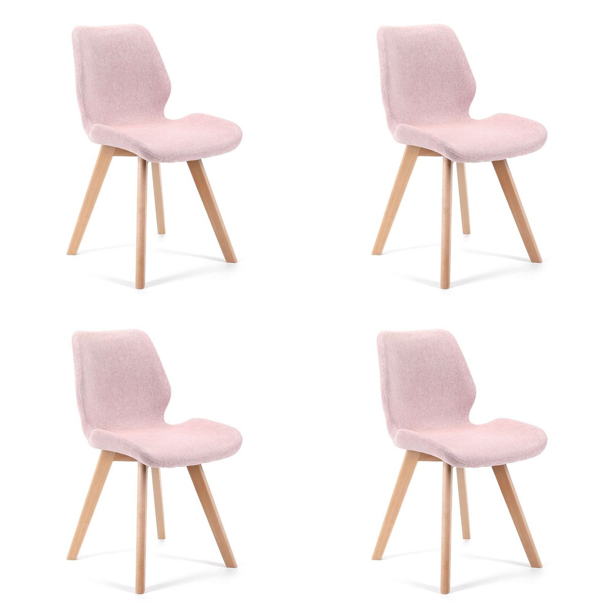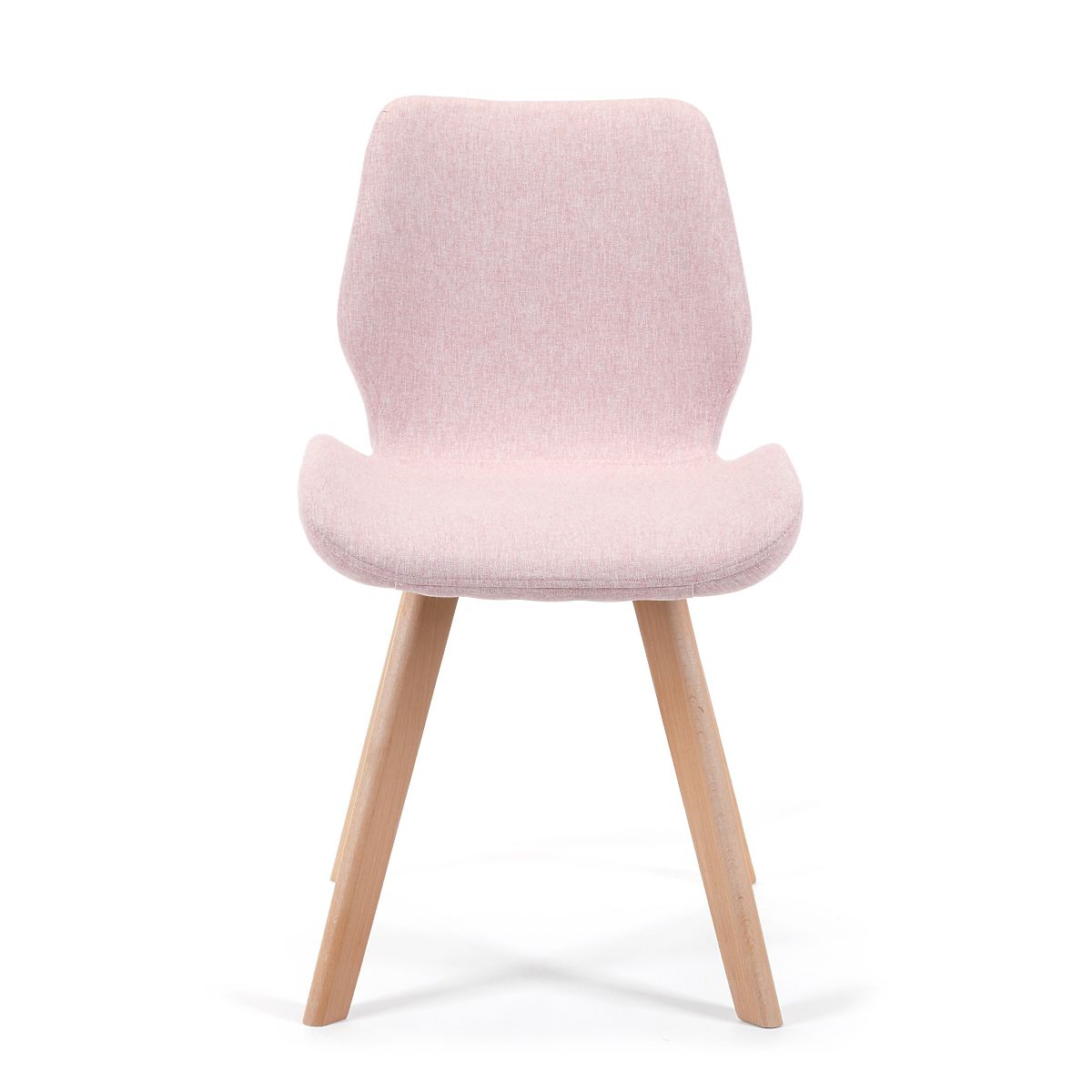 Stolička v škandinávskom štýle s ružovým čalúnením a drevenými nohami. .. viac