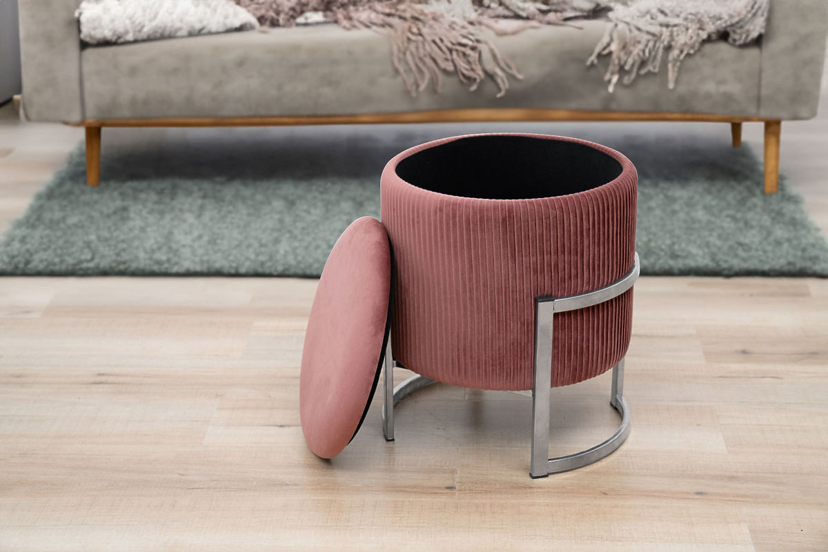 Podnožka alebo tiež puf je skvelým doplnkom do obývacej izby alebo spálne. Vďaka nemu môžu unavené nohy po celom dni chôdze odpočívať, a keď je puf vyrobený z mäkkého velúru, len to umocňuje príjemné pocity z odpočinku. Moderný vzhľad dopĺňajú detaily, v našom pufe sme použili kovovú základňu v striebornej farbe. Otváracie veko poskytuje prístup k úložnému priestoru, kam možno uložiť predmety, ktoré nie sú potrebné na každodenné použitie.Špecifikácie: