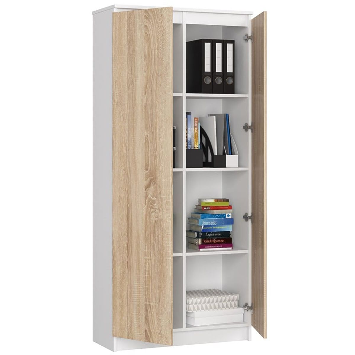 Kancelárska skriňa R 80 cm Clip 2 je nábytok vo farbe biela/sonoma, čo je jedna z najobľúbenejších farieb tejto sezóny. Táto knižnica prinesie do vašej kancelárie poriadok a harmóniu. Je vybavená ôsmimi priestrannými policami, v ktorých uložíte všetky potrebné veci v kancelárii. Navyše sú jej hrany olepené ABS hranou, ktorá poskytuje vysokú ochranu proti poškodeniu. Medzi výhody tejto knižnice patria: