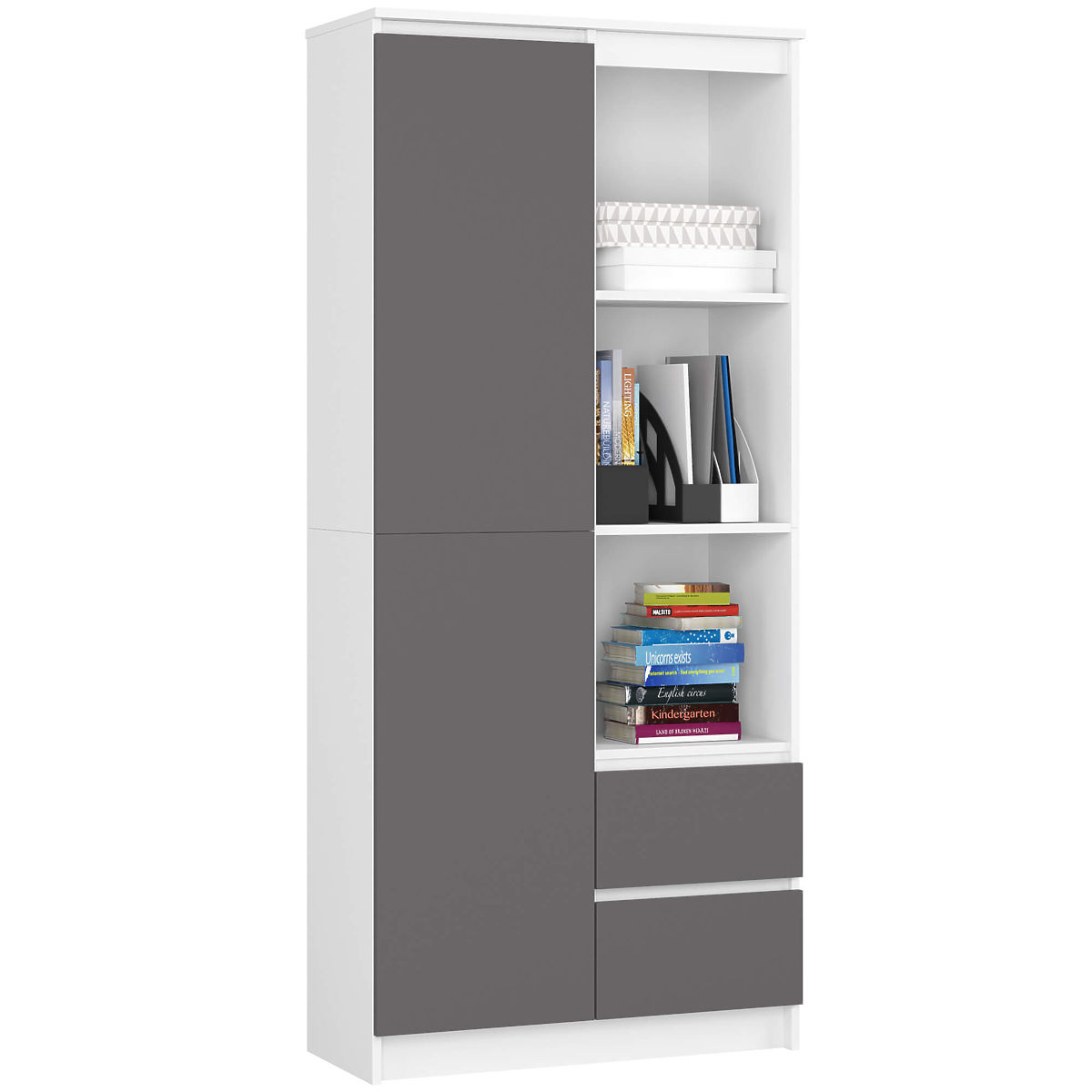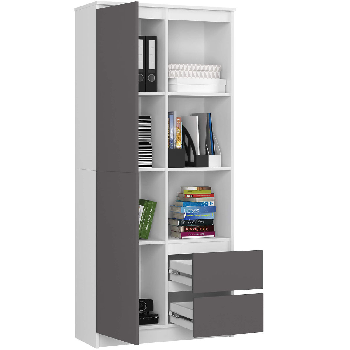 Kancelársky regál s dvierkami a zásuvkami v kombinácii bielej a grafitovo šedej farby.