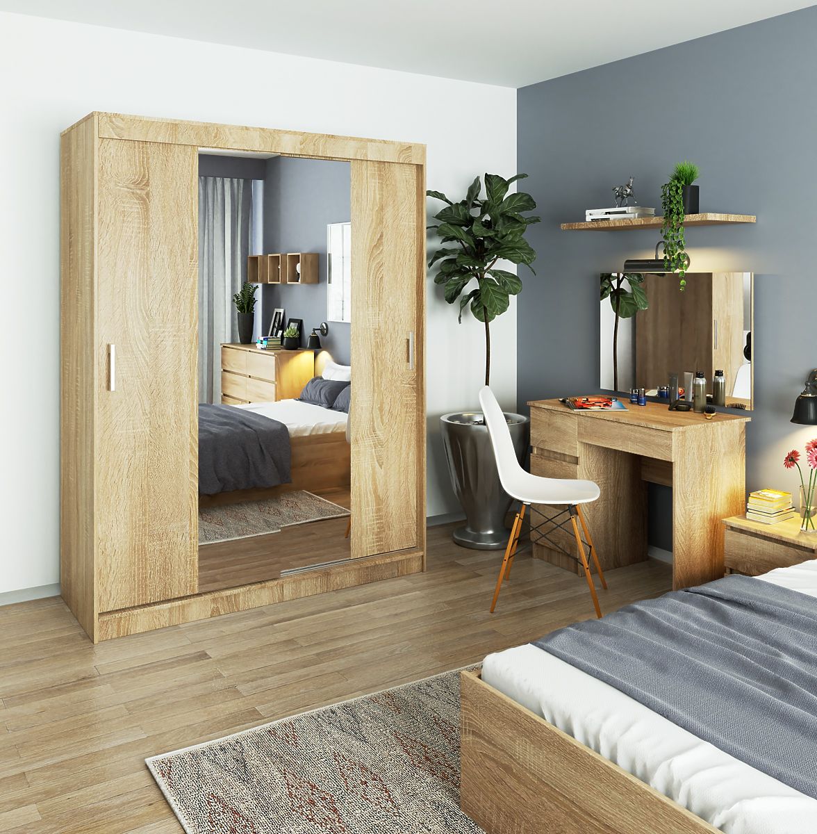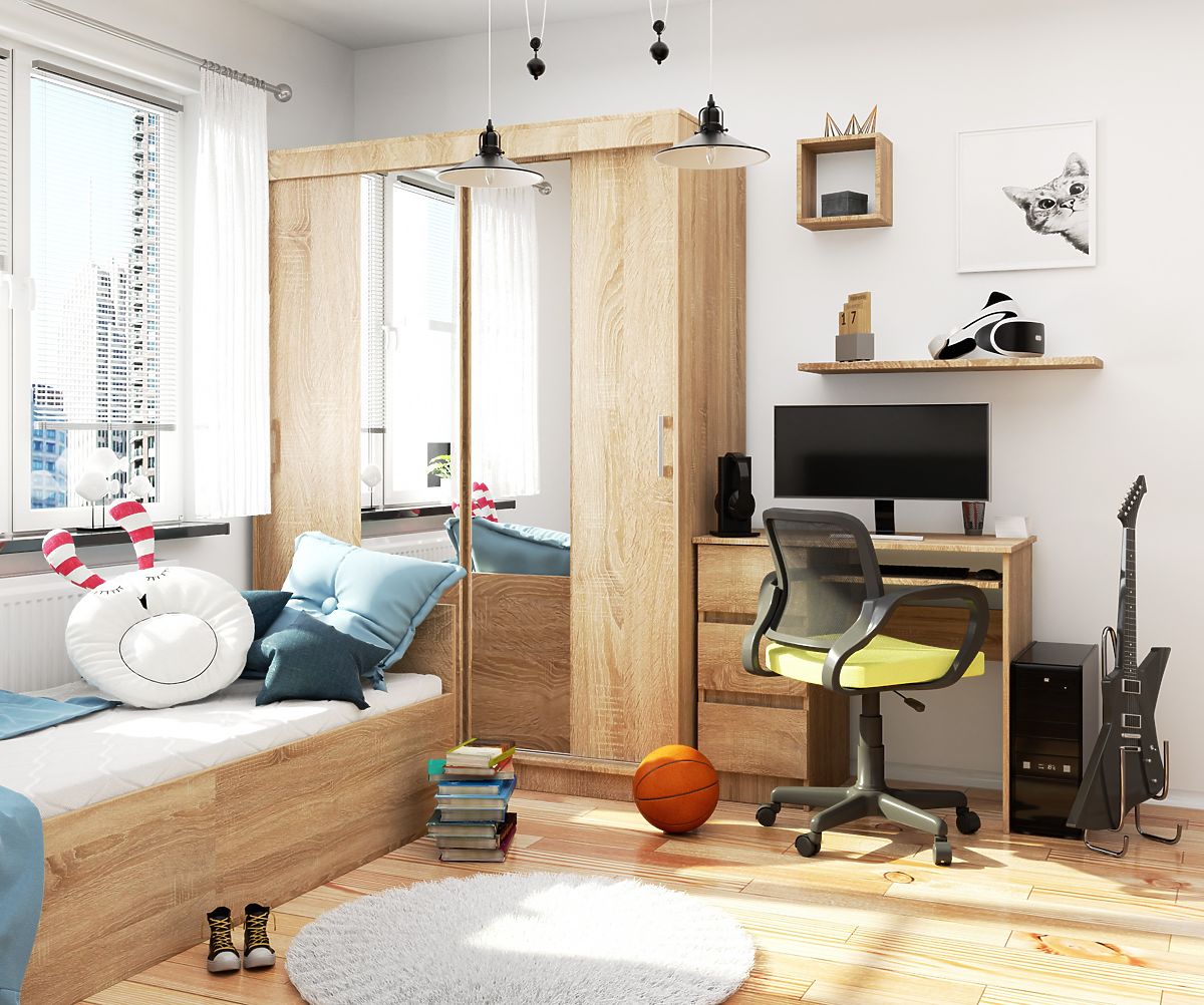 Priestranná šatníková skriňa vo farbe dubu sonoma, s posuvnými dverami a zrkadlom, je univerzálny a nadčasový nábytok, ktorý splní svoju funkciu v takmer každej obytnej miestnosti. Skvele sa hodí do detskej a mládežníckej izby, rovnako ako do spálne alebo šatne. Vo vhodne veľkej predsieni môže slúžiť ako skriňa na vrchné odevy a ďalšie potreby nevyhnutné v domácnosti.