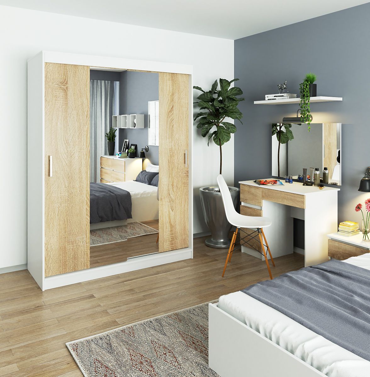 Posuvná biela skriňa s dverami v dekore dub sonoma a zrkadlom. .. viac