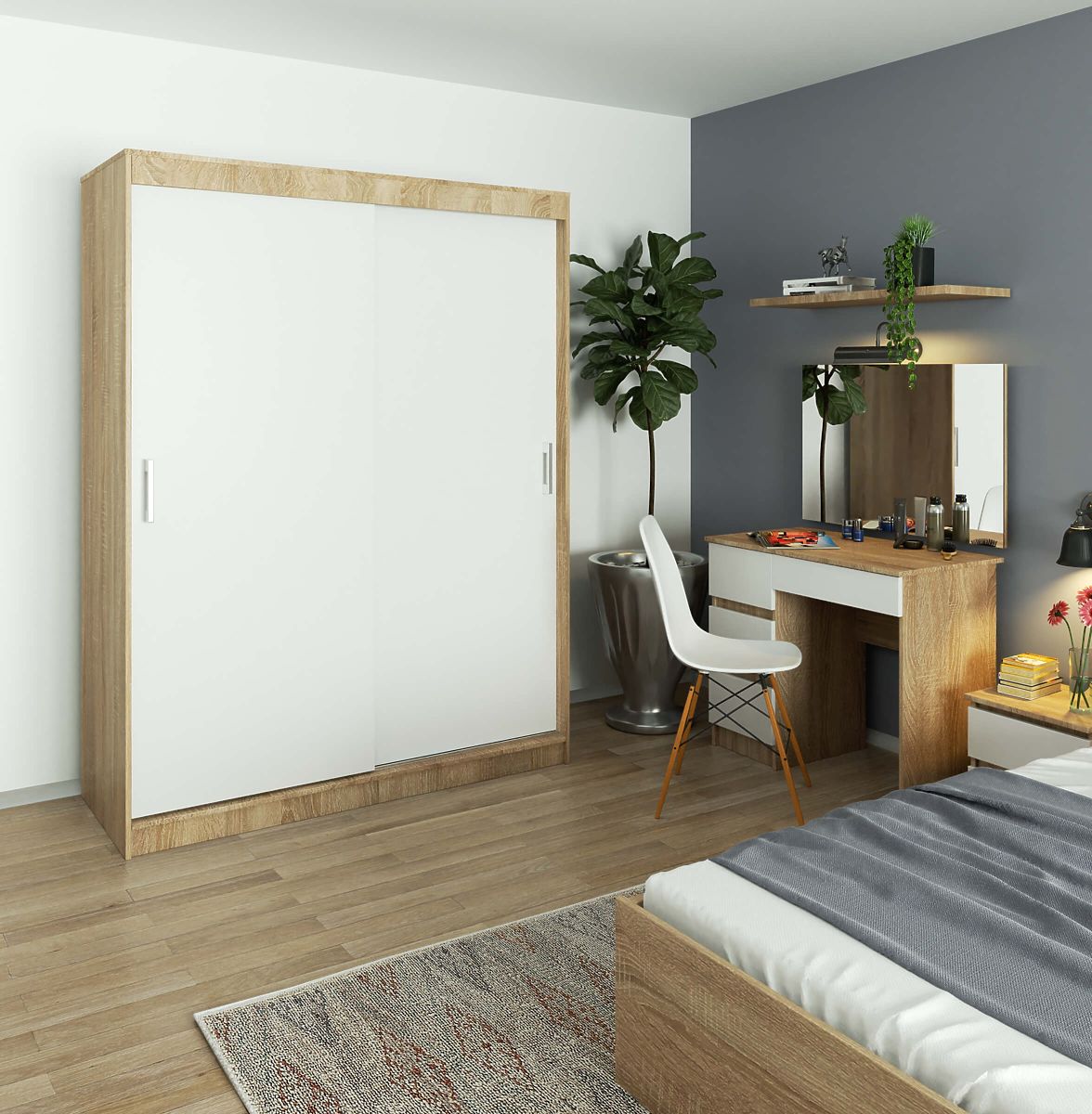 Posuvná skriňa 150 cm CLP MONO SONOMA/BIELA je kus nábytku, v ktorom pohodlne umiestnite všetko svoje oblečenie. Ocenia ju ako ženy, ktoré majú rady poriadok, tak praktickí muži. Nájdete tu miesto na svetre, blúzky, tričká, nohavice, sukne a obľúbené šaty. Voľne zavesíte dlhší kabát aj teplú bundu či oblek. Schováte tiež topánky, čiapky, šály alebo rukavice. Táto priestranná skriňa sa bude hodiť do miestností zariadených v modernom, minimalistickom štýle. Podčiarkne ich charakter a tiež presvetlí nedostatočne osvetlený interiér, akým je zvyčajne predsieň.
