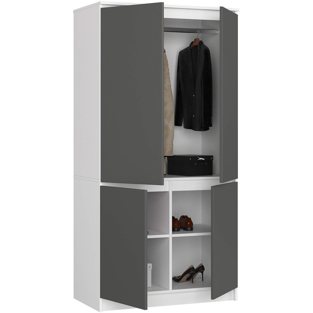 Štvor-dverová skriňa je univerzálny a praktický kus nábytku, ktorý skvele doplní vybavenie spálne, predsiene alebo obývacej izby v štúdiových interiéroch. Elegantné prevedenie a farebnosť biela grafitová sivá spôsobuje, že skriňa sa ideálne hodí do klasických aj moderných aranžmánov. Skriňa je vybavená priestrannými policami, ktoré sú ideálne na ukladanie odevných prvkov alebo náhradných povlakov na prikrývky a vankúše, prestieradiel, obrusov alebo dek. V časti nábytku umiestnenej za výklopnými dverami sa nachádza tyč na ramienka. Police možno použiť na svetre, blúzky, kabelky, ale aj napríklad na uteráky. Naopak tyč sa osvedčí ako miesto na zavesenie oblekov, šiat, sukní a vrchného oblečenia, ako sú kabáty alebo bundy. Nábytok sa vyznačuje precíznym spracovaním z najkvalitnejšej laminovanej dosky, ktorá je odolná proti oderu. Hrany skrine boli dokončené estetickou ABS hranou.