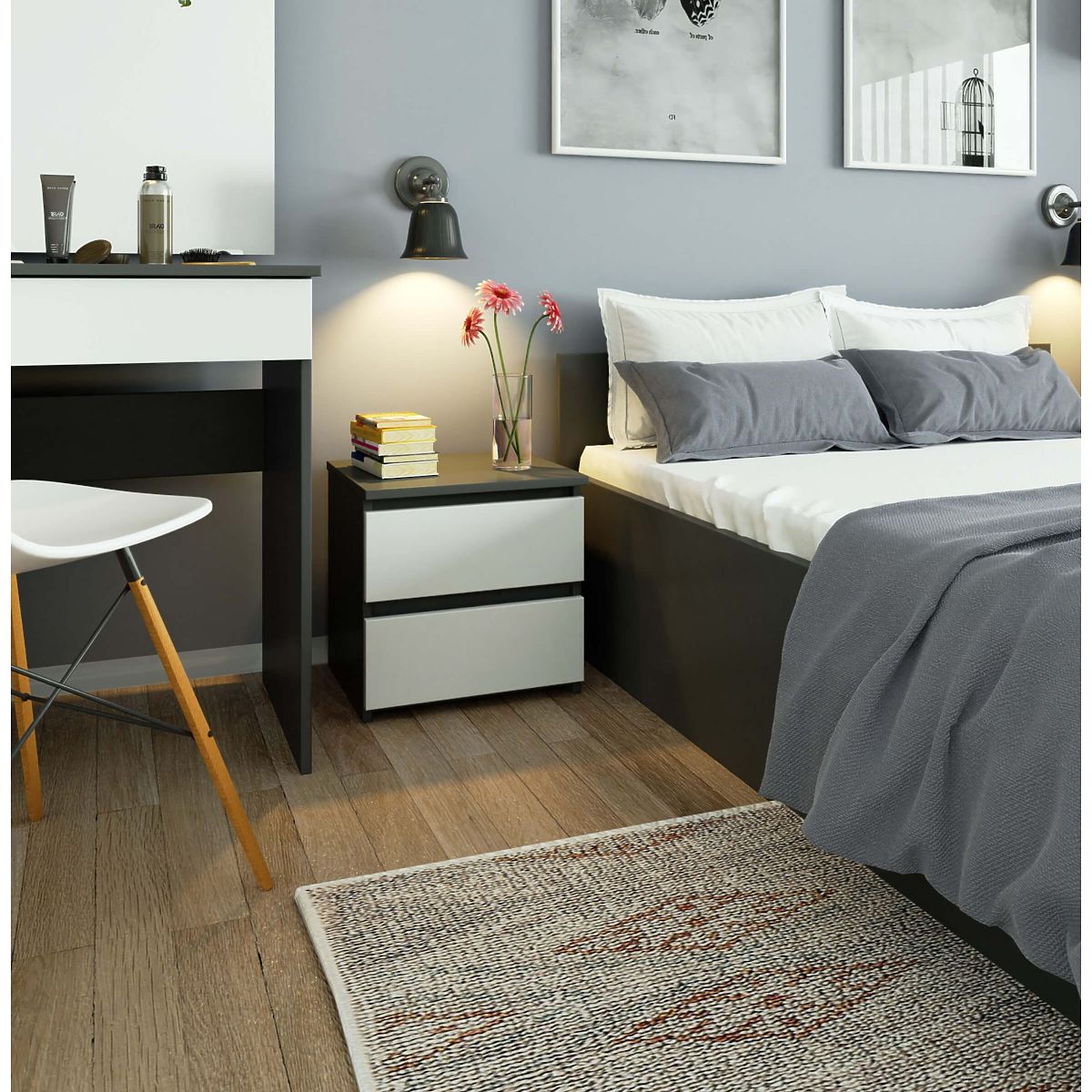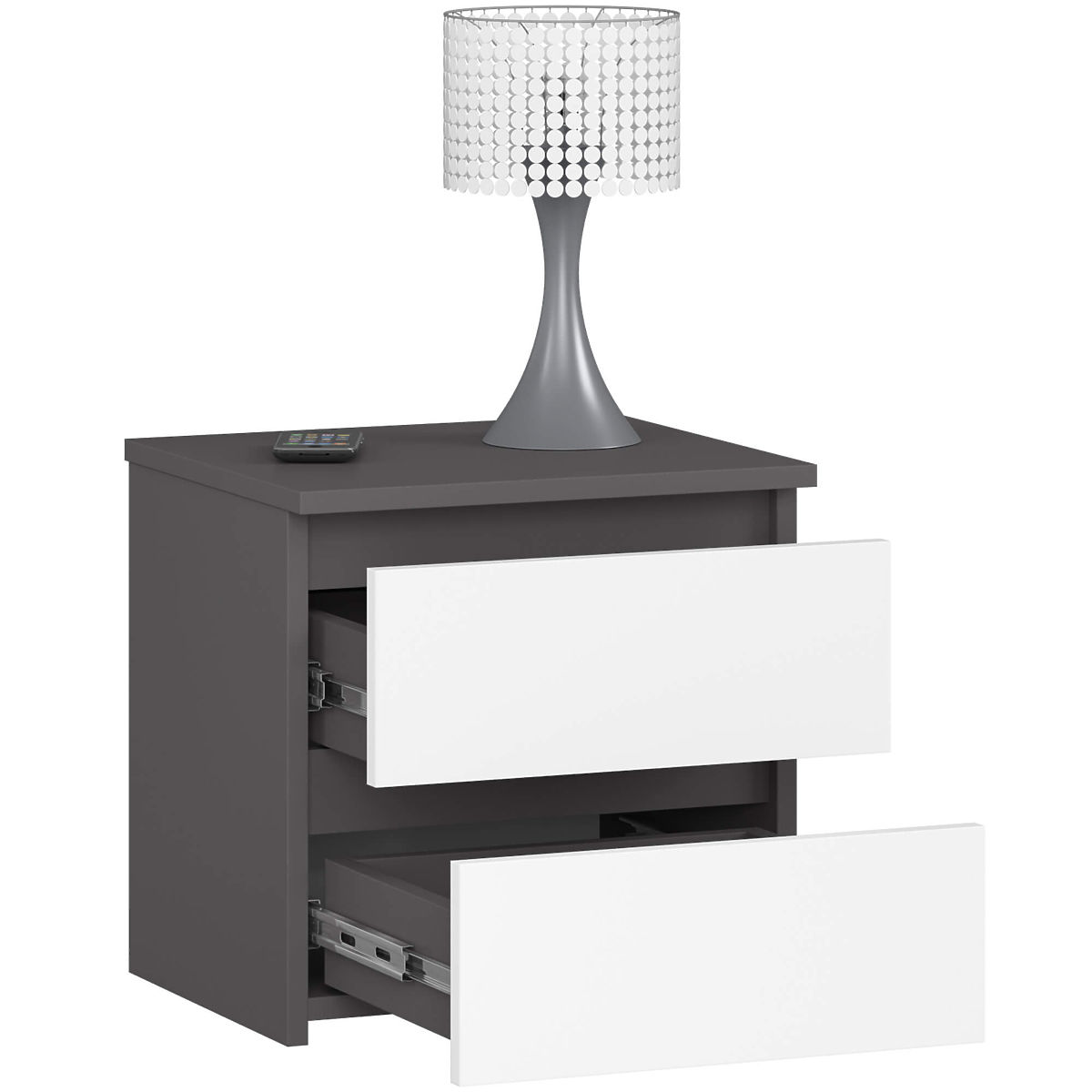 Nočné stolíky sú obľúbeným typom nábytku, ktorý sa umiestňuje vedľa postele. Na jeho doske možno umiestniť lampu, zatiaľ čo do zásuviek - dôležité predmety, ktoré zlepšujú kvalitu odpočinku a spánku. V našej ponuke je k dispozícii nočný stolík CL2 40 cm v farbe grafitová šedá s bielymi čelami. Pôsobí elegantne a moderne, a zároveň je funkčný. Skvele sa hodí do každej spálne aj do izby pre mladých.