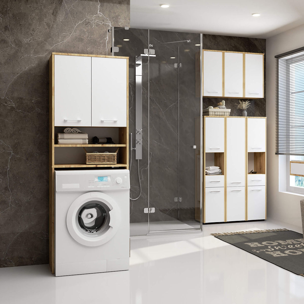 Kúpeľňová skrinka nad práčku je praktický a atraktívny dizajnový nábytok. Regál má v spodnej časti, priamo nad výklenkom pre práčku, dve priestranné police a v hornej časti objemný úložný priestor uzatvárateľný dvojitými dvierkami. Skrinka má univerzálne použitie a uľahčuje dokonalé využitie priestoru v kúpeľni a udržanie bezchybného poriadku. Nábytok možno použiť na uteráky, čistiace prostriedky alebo pracie prášky a aviváže. Kúpeľňový stĺp nad práčku je vyrobený z laminovanej dosky odolnej proti vlhkosti a oderu. Pre starostlivé dokončenie hrán nábytku použil výrobca odolnú ABS hranu. Dvierka nábytku sú vybavené pohodlnými a estetickými kovovými úchytmi. Kúpeľňový regál, ktorý kombinuje dve farby – klasickú bielu a dub artisan, sa ľahko zladí s akýmkoľvek typom kúpeľňového interiéru. Kúpeľňová skrinka vyzerá ľahko, a preto sa efektívne prezentuje aj v kúpeľniach s nestandardne malou plochou.