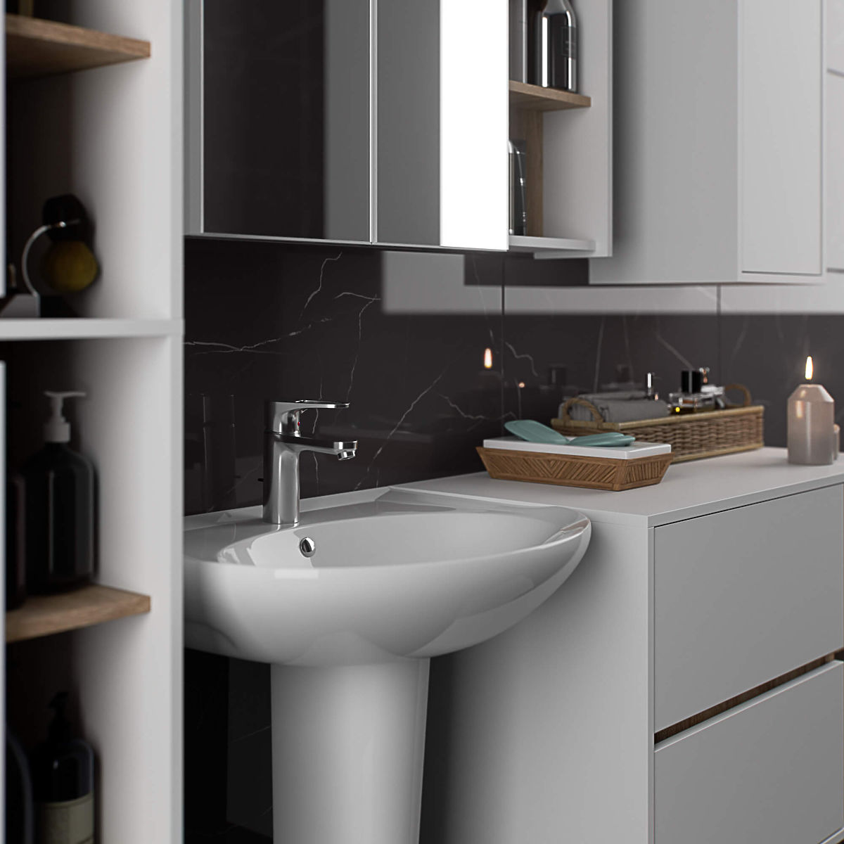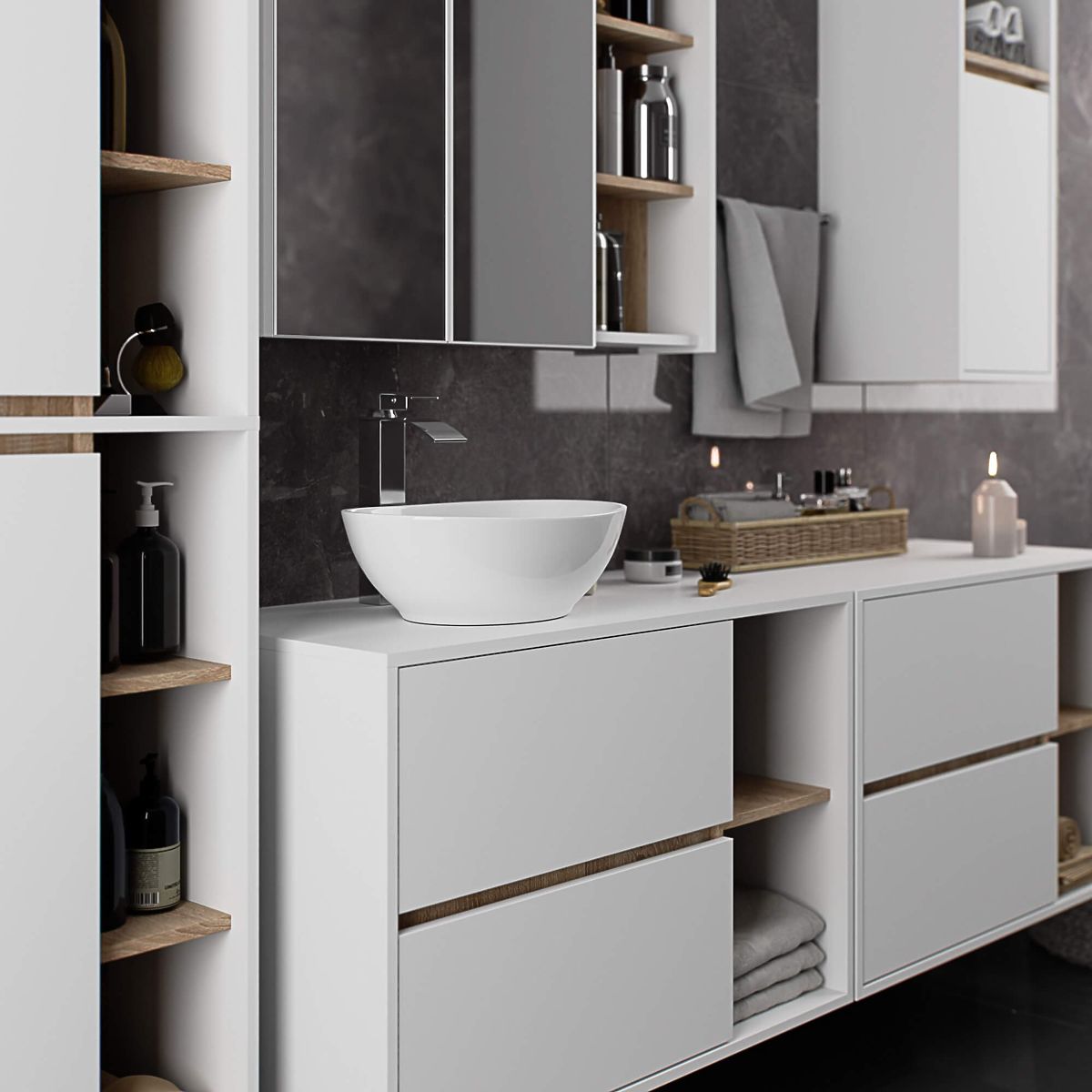 Kúpeľňové skrinky skvele dopĺňajú vybavenie kúpeľne, poskytujú potrebné miesto na všetky kozmetické prípravky a detergenty a dodávajú kúpeľni určitý štýl. Priestranné skrinky uľahčujú udržiavanie poriadku v miestnosti, čo priaznivo ovplyvňuje estetiku interiéru. Kolekcia VAMI sa vyznačuje pútavou štýlovou farebnosťou – korpus a čelá majú rovnakú farbu, zatiaľ čo vnútorná farba je iná.