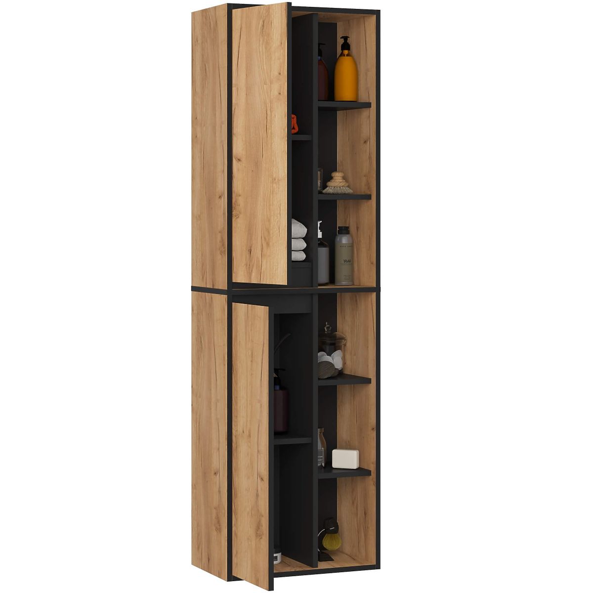 Vysoká kúpeľňová skrinka VAMI W50 je určená na montáž na stenu. Vďaka tejto skrinke nájdu všetky kozmetické prípravky, kúpeľňové doplnky a uteráky svoje miesto a interiér bude vyzerať upravene. Premyslená konfigurácia s uzavretou a otvorenou časťou umožňuje pohodlné uskladnenie rôznych produktov. Vysoká kúpeľňová skrinka VAMI W50 má nasledujúce rozmery: šírka 50 cm, výška 170 cm a hĺbka 30 cm.