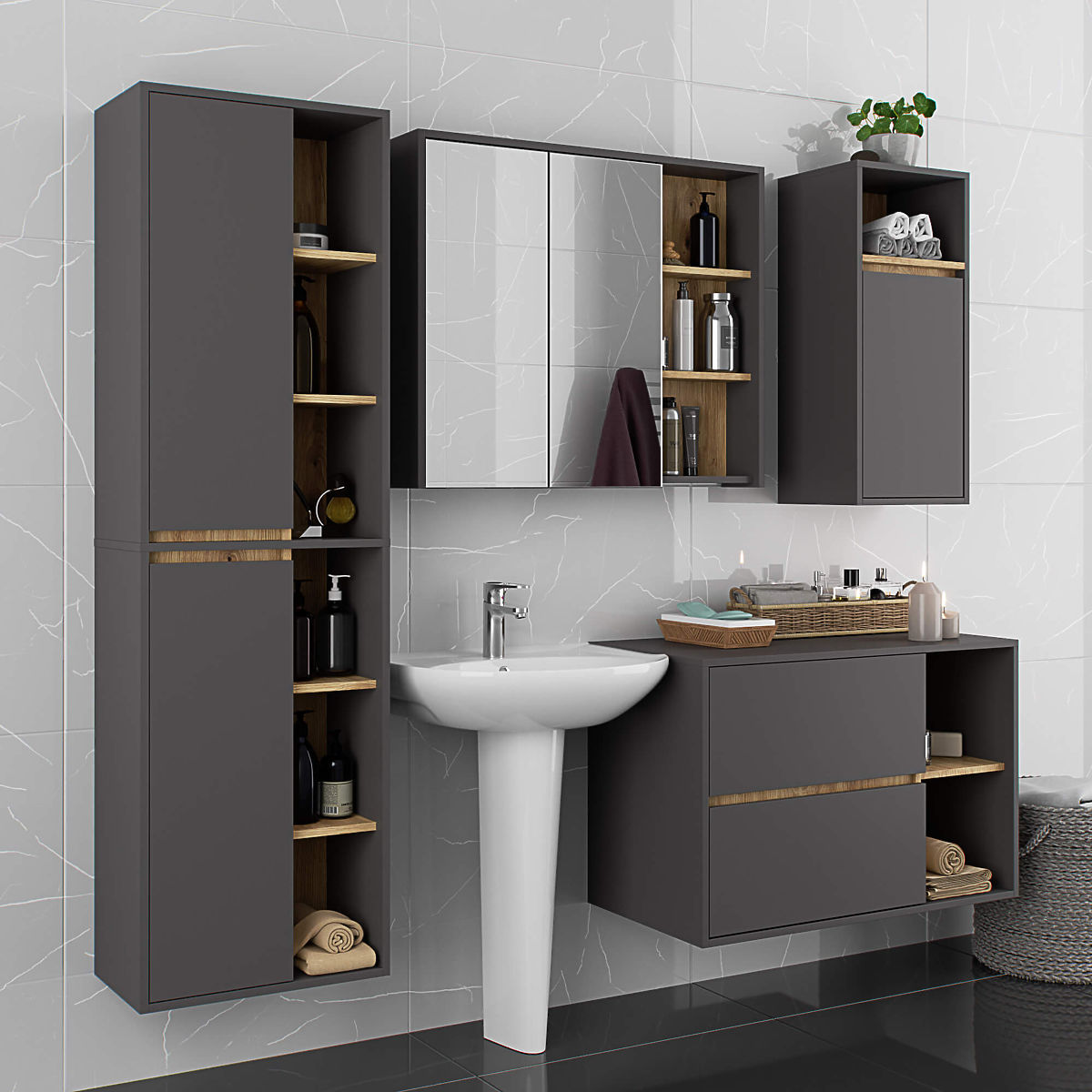 Lukahome.sk » Kúpeľňa a WC / Kúpeľňové skrinky / ZÁVESNÁ KÚPEĽŇOVÁ SKRINKA VAMI W50 2D 6P GRAFITOVÁ ŠEDÁ / DUB ARTISAN