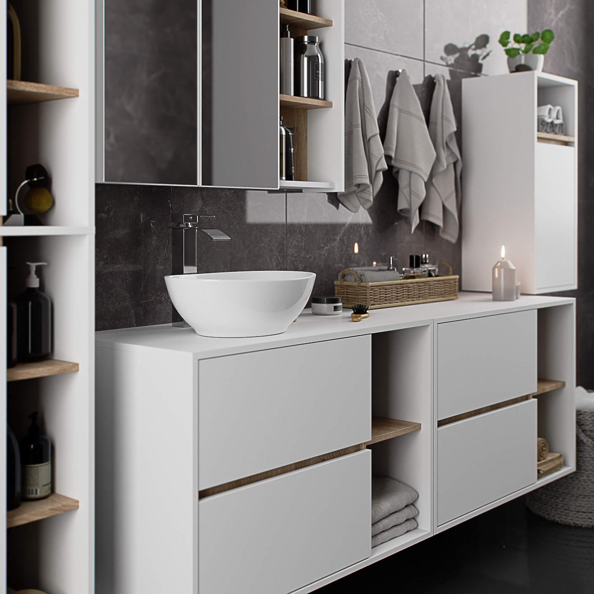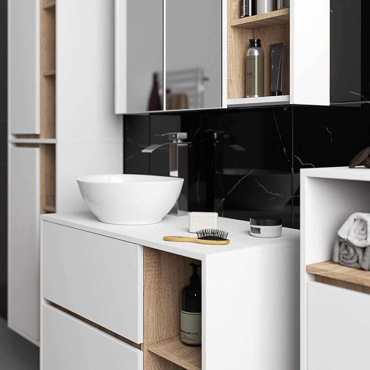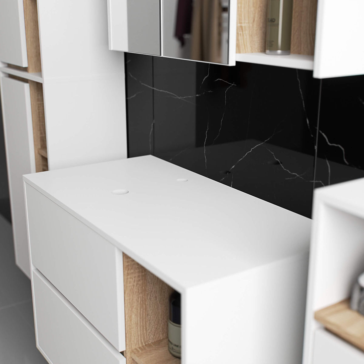 Závesná skrinka do kúpeľne pod umývadlo 90 cm VAMI W90 perfektne zapadá do moderného interiéru. Konfigurácia s 2 zásuvkami a 2 otvorenými policami ponúka veľké pohodlie pri používaní. Do priestranných zásuviek možno uložiť hygienické a kozmetické produkty, zatiaľ čo na otvorených policiach môžete umiestniť napr. dekorácie, ktoré dodajú interiéru osobnejší charakter. Tento model závesnej skrinky pod umývadlo má v doske 2 otvory určené na montáž umývadla a sifónu. Skrinka má tiež špeciálne tvarované zásuvky, ktoré umožňujú inštaláciu sifónu a hydraulických prvkov. POZOR! Nábytok je dodávaný bez umývadla a armatúry.