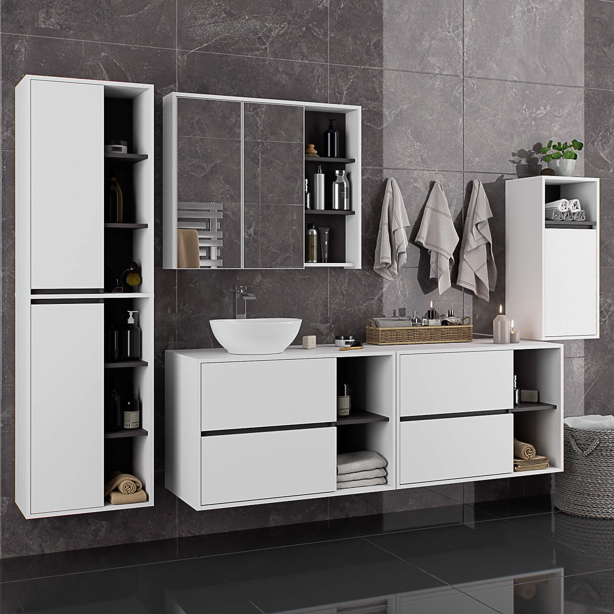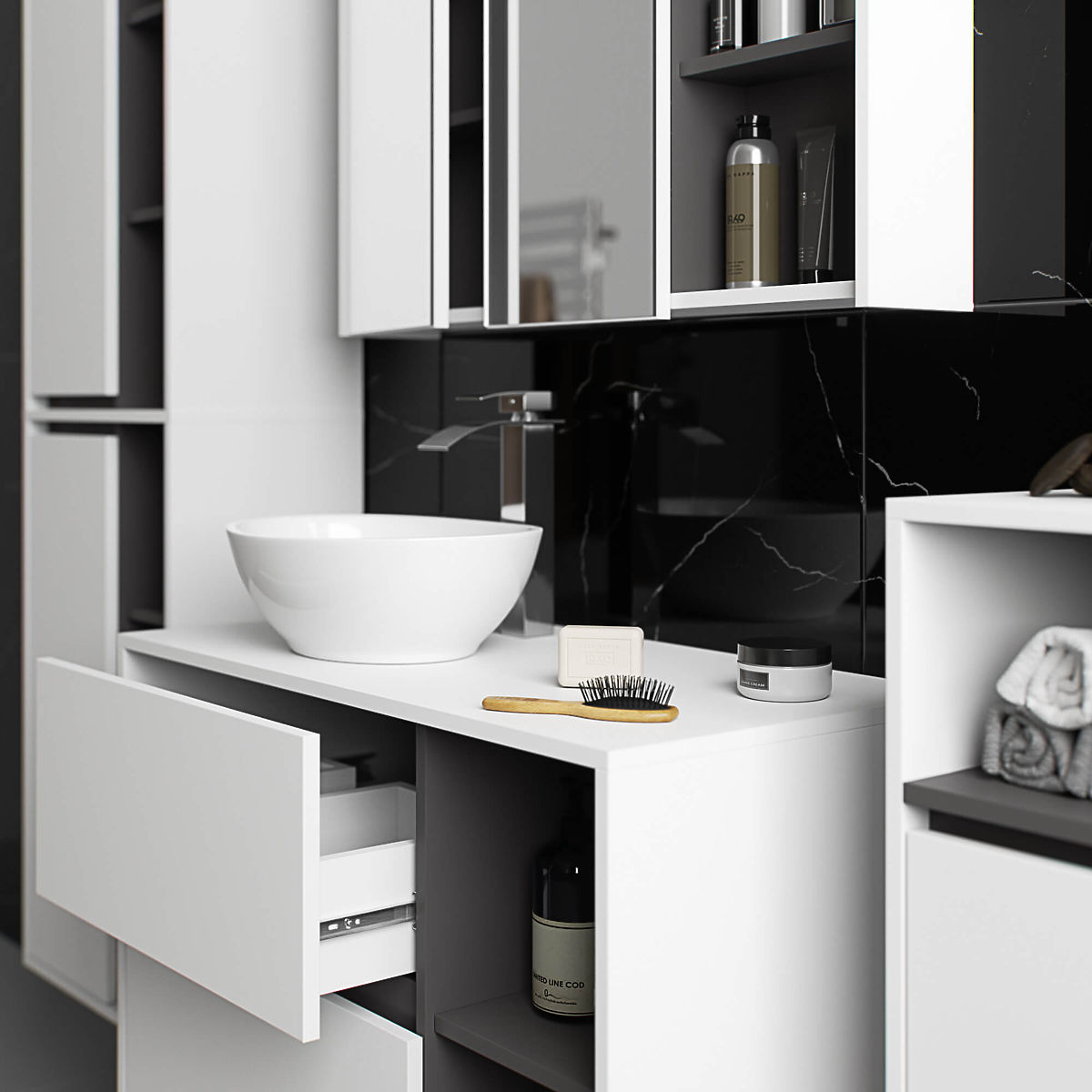 Závesná skrinka do kúpeľne pod umývadlo 90 cm VAMI W90 perfektne ladí s moderným interiérom. Konfigurácia s 2 zásuvkami a 2 otvorenými policami ponúka veľké pohodlie pri používaní. Do priestranných zásuviek možno uložiť hygienické a kozmetické produkty a na otvorené police umiestniť napríklad dekorácie, ktoré dodajú interiéru osobitý charakter. Opisovaný model závesnej skrinky pod umývadlo má v doske 2 otvory určené na montáž umývadla a sifónu. Skrinka má tiež špeciálne tvarované zásuvky, ktoré umožňujú inštaláciu sifónu a hydraulických prvkov. POZOR! Nábytok je dodávaný bez umývadla a armatúry.