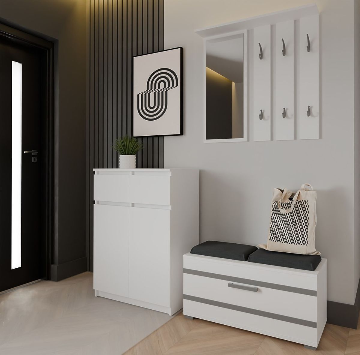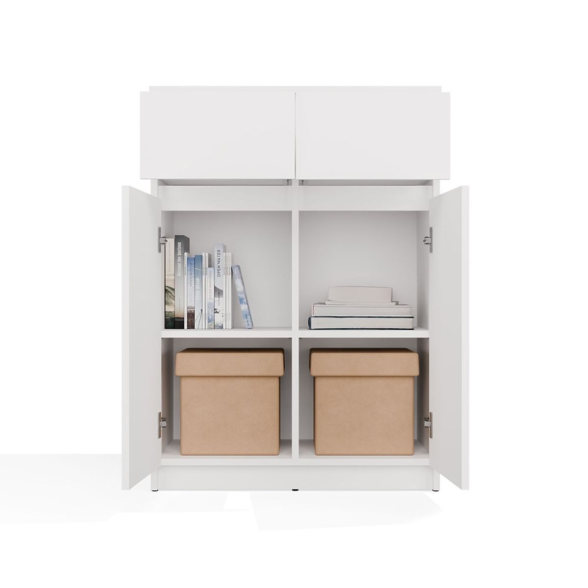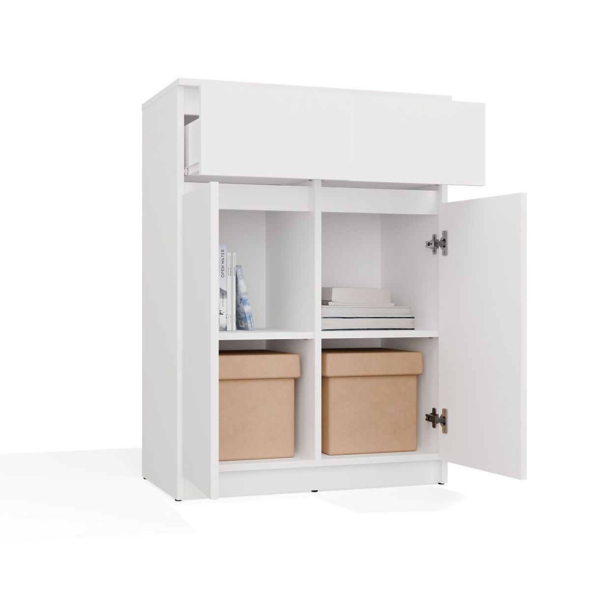 Biela komoda s dvoma dverami a zásuvkami pre priestranné úložisko. .. viac