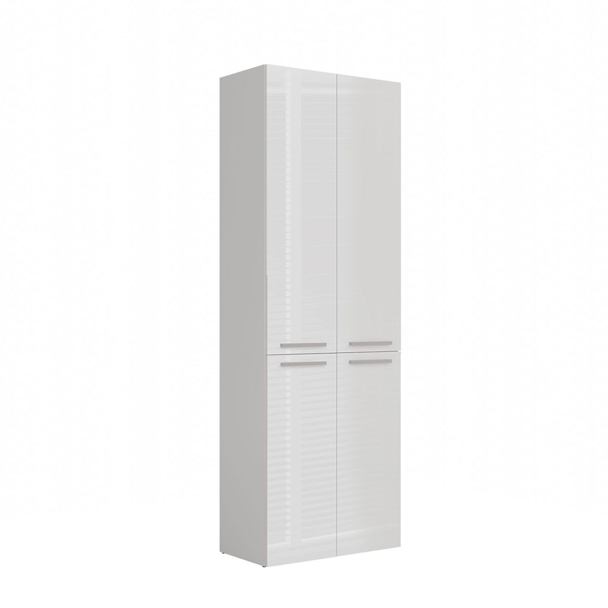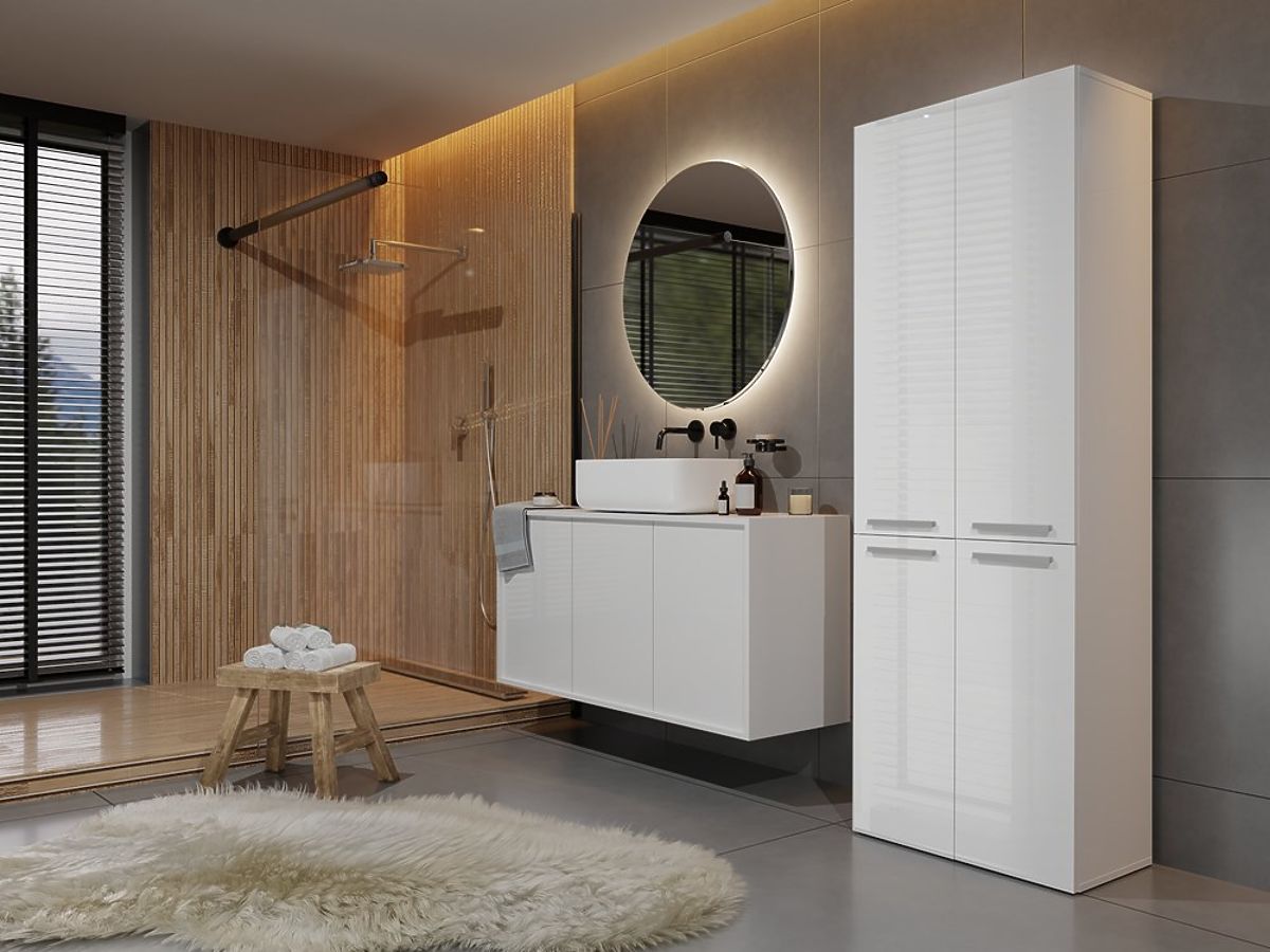 Kúpeľňová skrinka s bielym leskom a praktickými policami. .. viac
