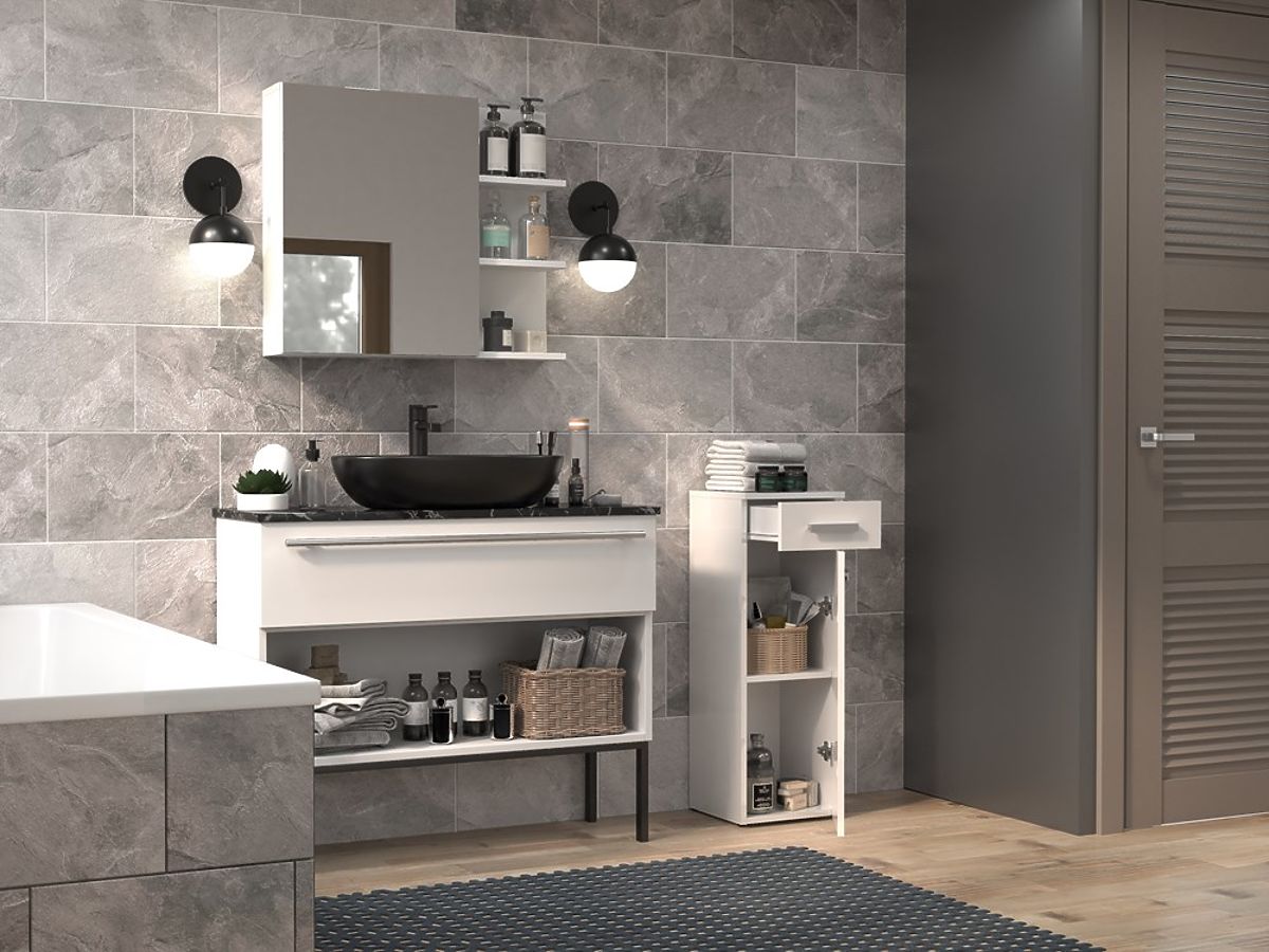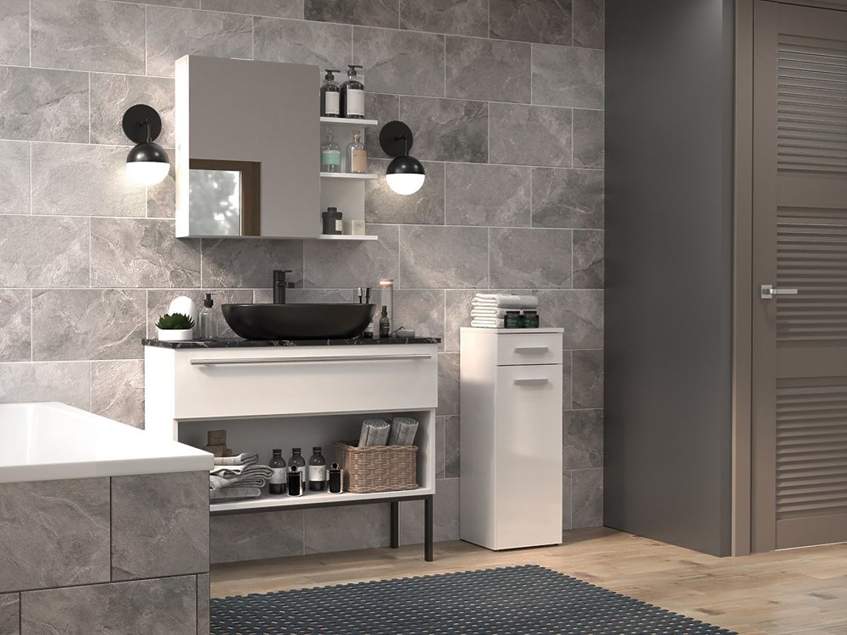 Kúpeľňová skrinka s praktickou zásuvkou a jednými dverami. .. viac