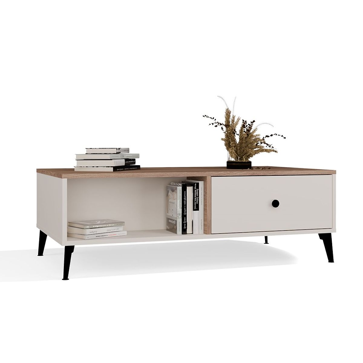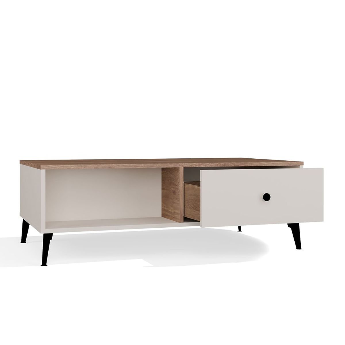 Čierny detail v podobe úchytiek a vysokých, kovových nožičiek dodáva nábytku ľahkosť a charakter. Na oboch stranách stolíka sa nachádzajú praktické zásuvky s tichým dovieraním – ideálne pre drobné predmety každodennej potreby. Centrálne otvorené police poslúžia ako miesto pre časopisy, ovládače alebo knihy.