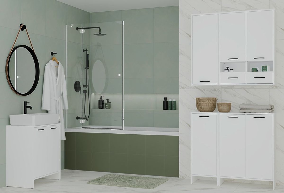 Praktická kúpeľňová skrinka s výklopným košom na prádlo. .. viac