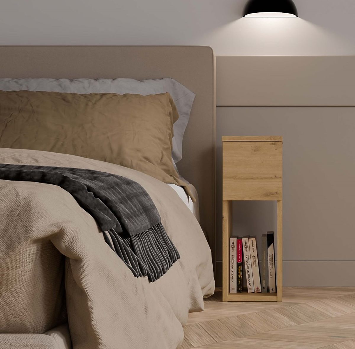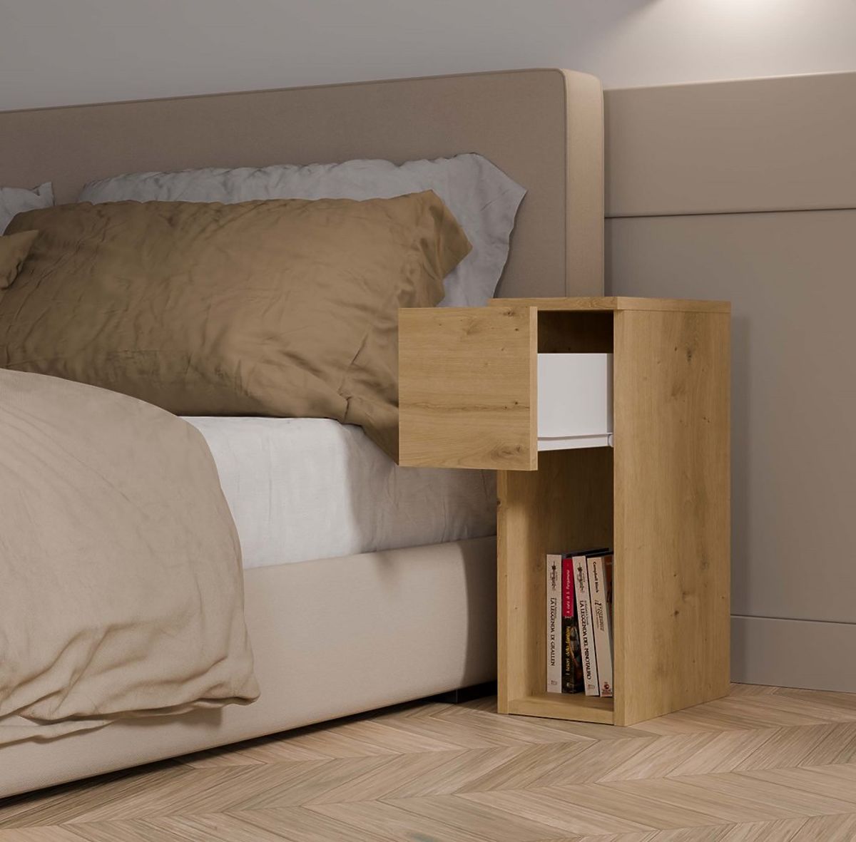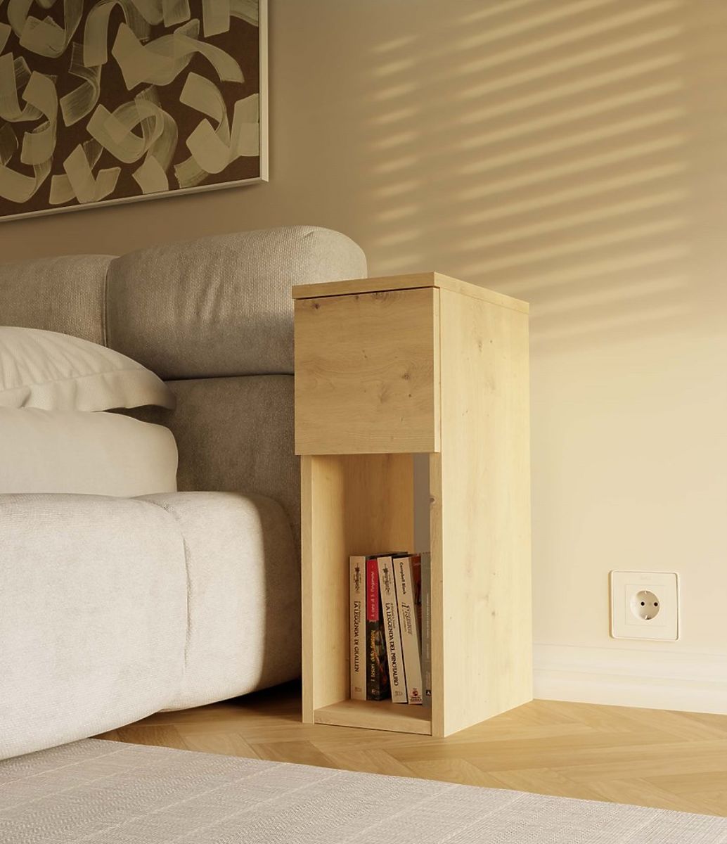 • Zásuvka a otvorená polica - ideálne pre uloženie najpotrebnejších vecí, ako je telefón, nabíjačka, kniha alebo okuliare.