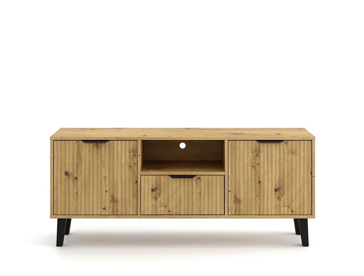 RTV skrinka SCANDI 2D1S SLIM je kombináciou funkčnosti a estetiky, ideálna pre milovníkov jednoduchých a zároveň štýlových interiérov. Teplý odtieň Dubu Artisan, drážkované čelá a štíhla forma na vysokých čiernych nohách dodávajú nábytku ľahkosť a výrazný charakter.