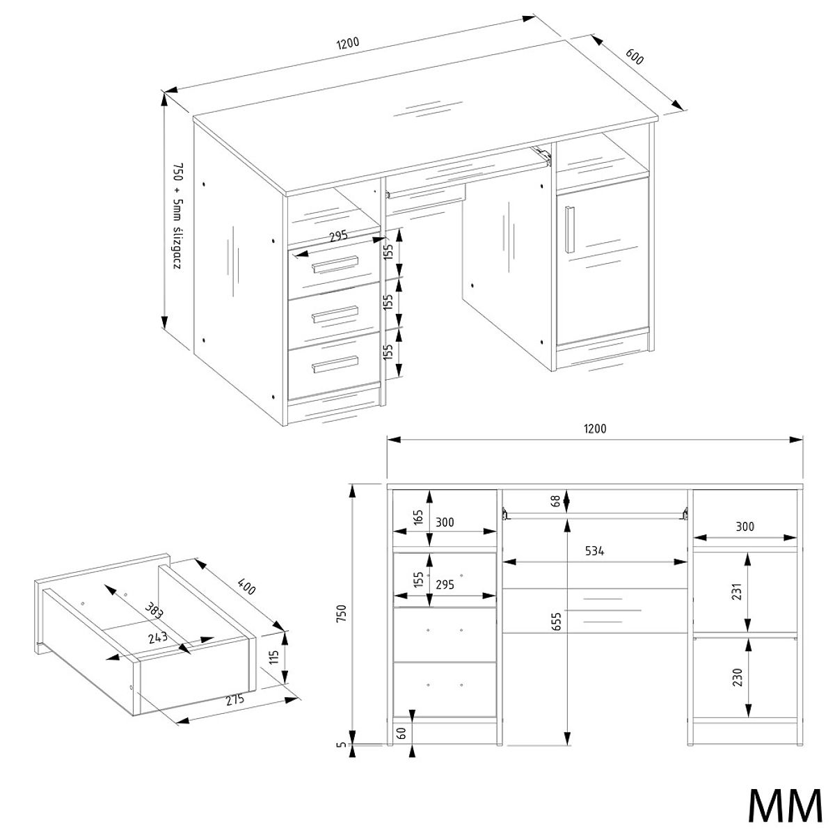 PÍSACÍ STÔL S 3 ZÁSUVKAMI, 1 DVERAMI A POLICAMI