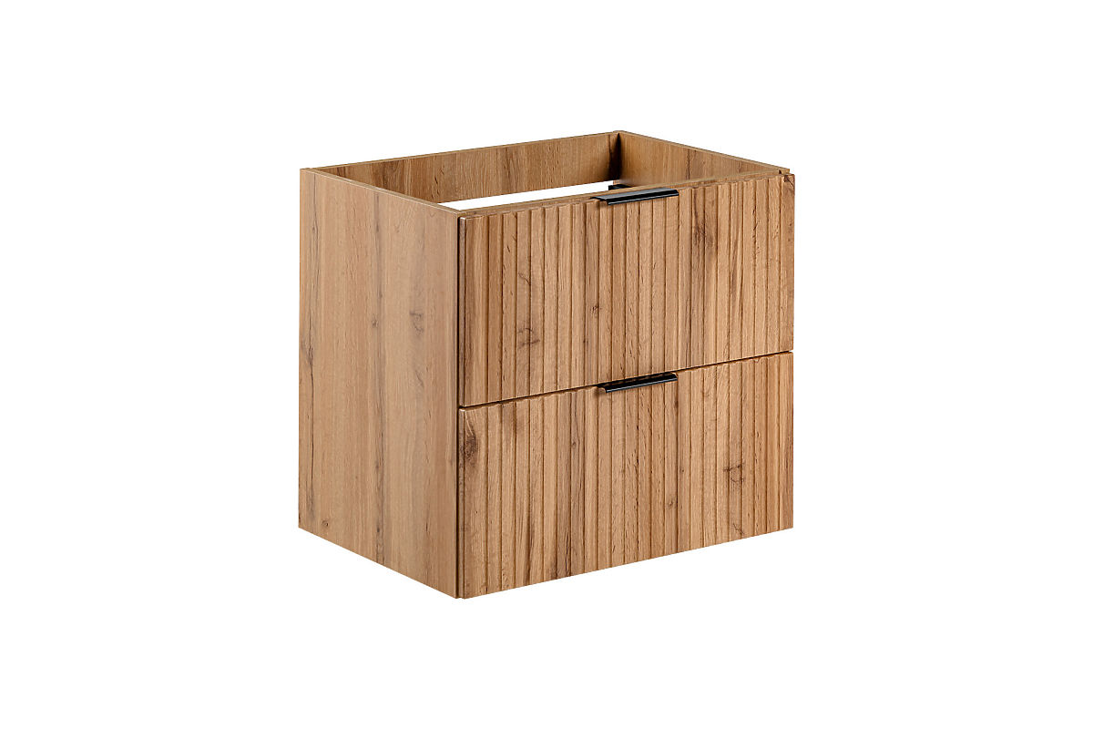 Skrinka pod umývadlo 60 cm s dvoma zásuvkami z kolekcie Adel Oak spája eleganciu s funkčnosťou. Vyznačuje sa klasickými proporciami a unikátnymi drážkovanými čelami. Úchyty v troch farbách - zlatý lesk, chróm lesk a čierny mat - jej dodávajú štýlový vzhľad.