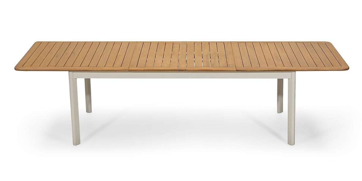Ako stôl, tak stoličky Porticato majú ľahkú, no pevnú konštrukciu z hliníka s práškovým nástrekom vo svetlo béžovej farbe. Toto riešenie zaručuje odolnosť proti korózii a mechanickému poškodeniu. Rozkladacia doska stola, vyrobená z trvanlivého akáciového dreva s teakovou úpravou, umožňuje ľahko prispôsobiť jeho dĺžku počtu hostí a príležitosti. Ďalšou výhodou je certifikát FSC®, ktorý potvrdzuje pôvod dreva z zodpovedne spravovaných zdrojov.