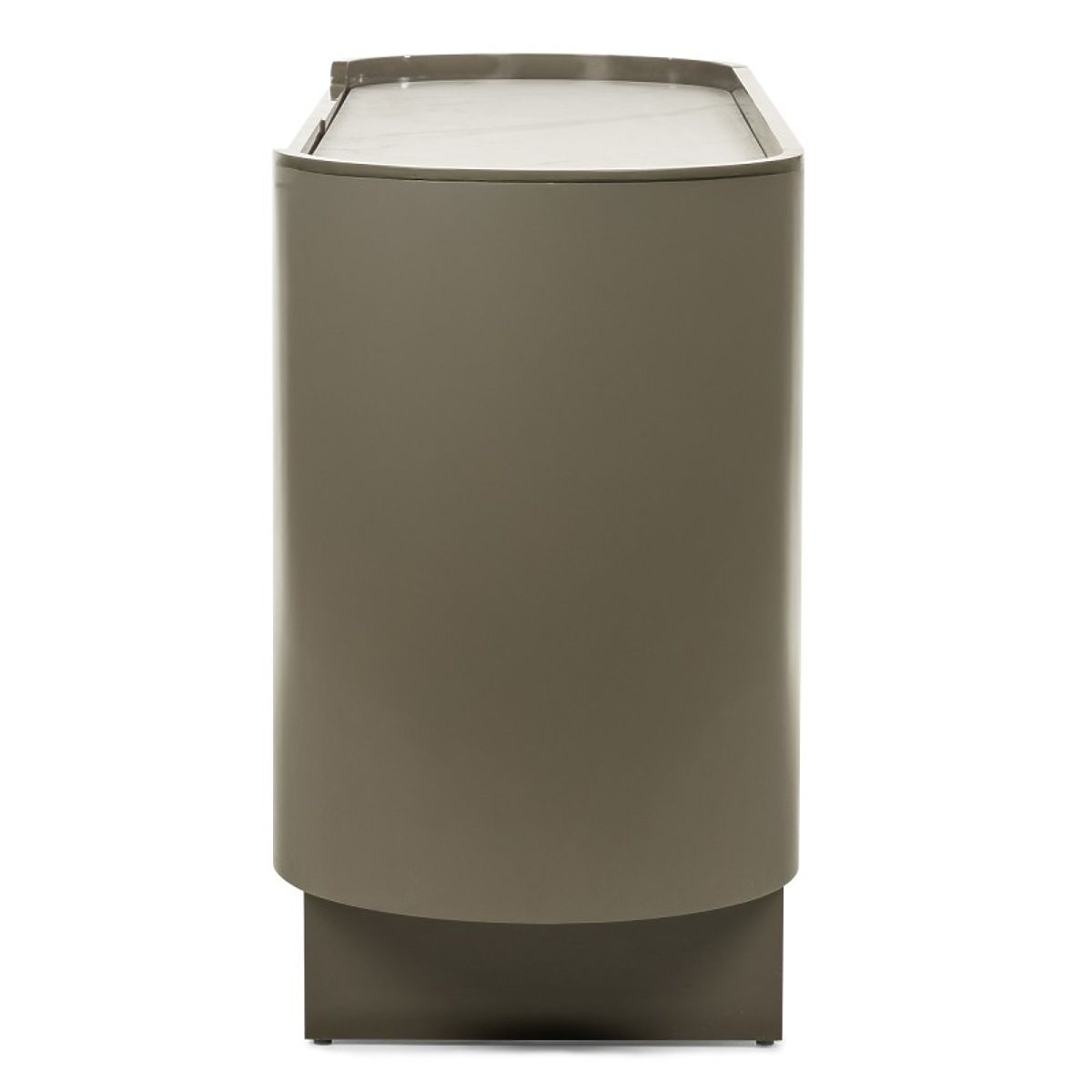 Už na prvý pohľad očarí - komoda Nari je dokonalým spojením moderného dizajnu a nadčasovej krásy. Jej zaoblené hrany a oválny tvar dodávajú ľahkosť a výnimočný pôvab. Doska zo spieku imitujúceho mramor dokonale ladí so zeleno-šedým odtieňom korpusu, vytvára výraznú kompozíciu, ktorá priťahuje pohľady. Hladké, bezúchytkové čelné plochy podčiarkujú minimalistický štýl komody a celkový vysoký lesk dodáva eleganciu a moderný charakter. Model Nari nie je len o dizajne, ale aj o funkčnosti – za dvierkami sa skrýva priestor určený na pohodlné ukladanie. Ak milujete krásne interiéry a neuznávate kompromisy medzi štýlom a funkčnosťou, komoda Nari je dokonalou voľbou! Povrchy s vysokým leskom sú náchylnejšie na poškriabanie. Pre ochranu komody odporúčame používať podložky pod umiestnené predmety.