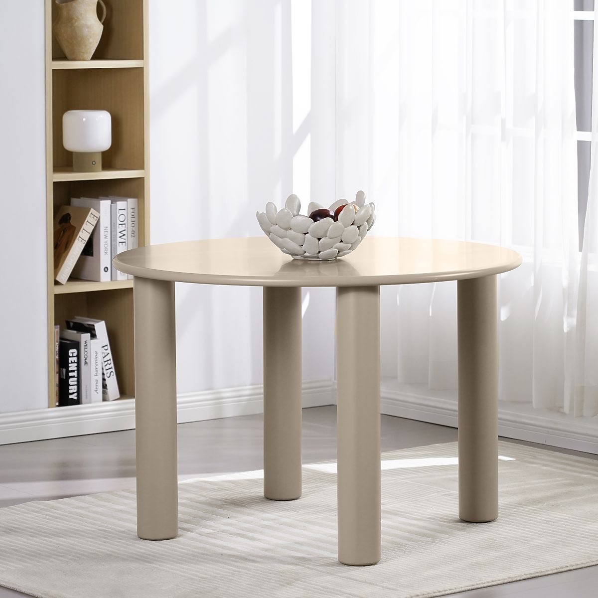 Stôl Joki spája súčasnú formu s funkčnosťou a stáva sa ústredným bodom každej jedálne. Jeho okrúhla doska vytvára priestor, kde si každý môže pohodlne sadnúť, a zároveň zdôrazňuje minimalistickú eleganciu stola. Štyri pevné, cylindrické nohy nie sú len solídnym základom stola, ale aj jemným detailom, ktorý mu dodáva charakter a stabilitu. Matný povrch v tmavo béžovej farbe harmonicky ladí s rôznymi aranžmánmi a prináša do interiéru vyvážený, moderný akcent.