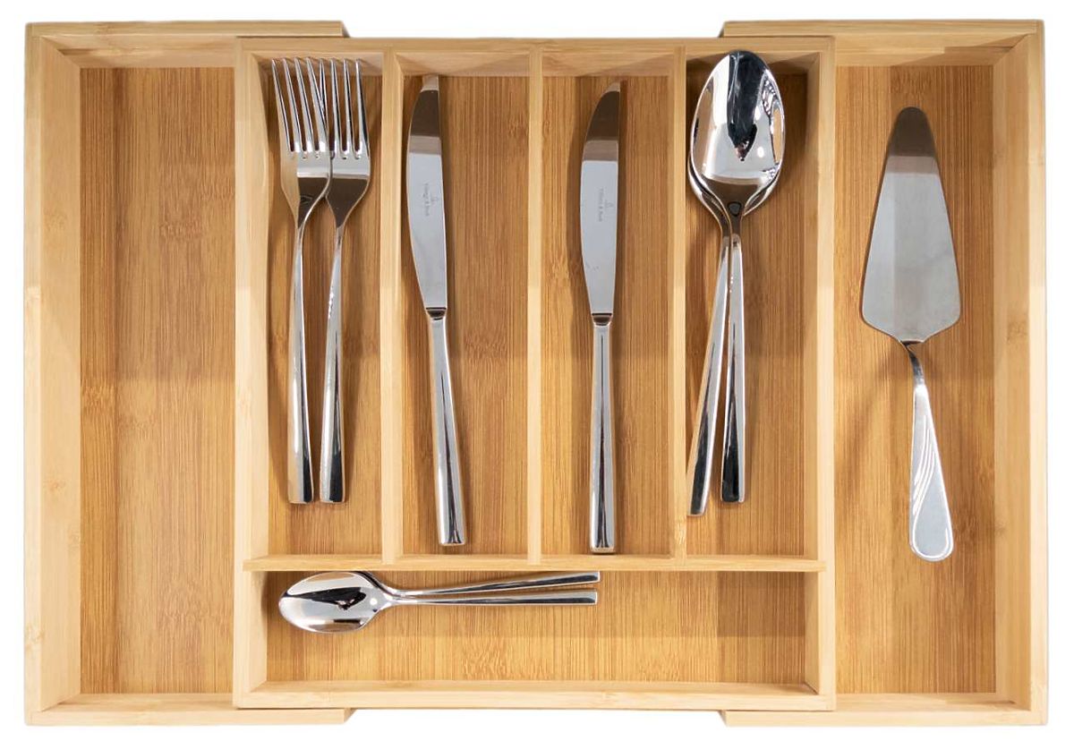 Praktický organizér na príbory vyrobený z prírodného bambusu. Bambusový organizér je veľmi priestranný. Má až 7 praktických priehradiek, päť na príbory a dve ďalšie na nože a väčšie kuchynské náradie. Bambusový organizér je rozkladací, bočné priehradky možno v prípade potreby zasunúť dovnútra a ušetriť tak cenný priestor. Vďaka nemu bude v kuchynských zásuvkách poriadok a čistota. Jeho kompaktné rozmery zaisťujú, že sa zmestí do väčšiny štandardných zásuviek.