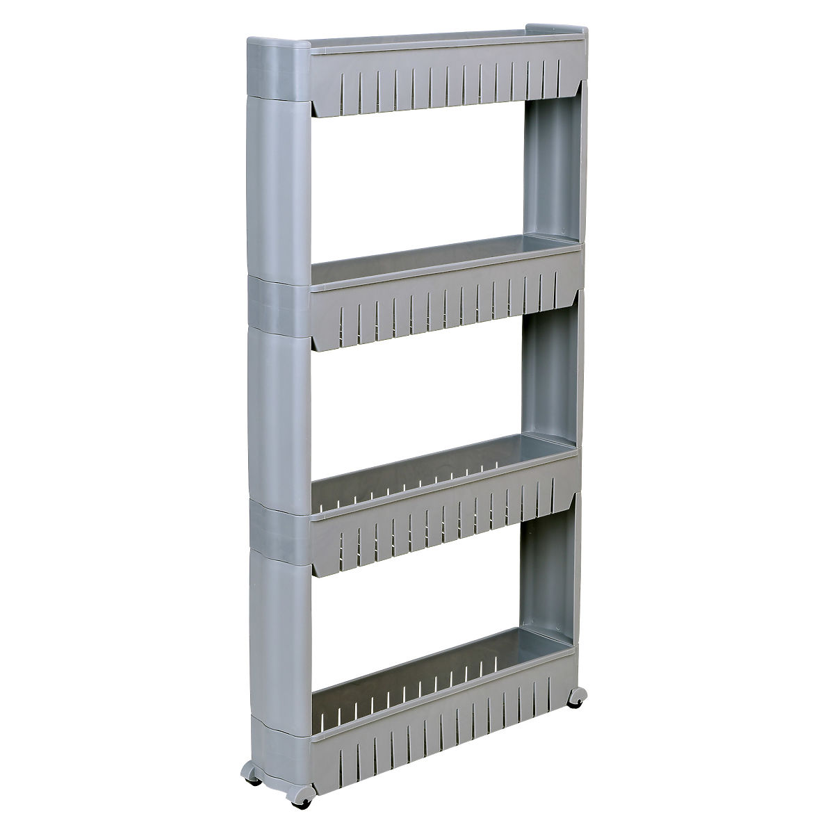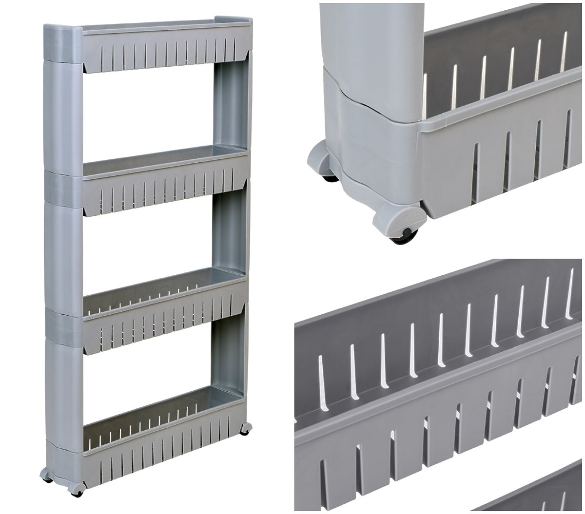 Mobilná skrinka ideálna pre úzke priestory, ako je kuchyňa alebo kúpeľňa. Jej modulárna konštrukcia z odolného plastu umožňuje ľahké prispôsobenie potrebám – police je možné pridávať alebo odoberať. Vďaka kompaktným rozmerom sa skvele hodí medzi skrinku a chladničku, práčku alebo na iné ťažko dostupné miesta. Kuchynský regál je výborný na ukladanie korenín, kuchynských doplnkov, kozmetiky, čistiacich prostriedkov a mnohých ďalších nevyhnutných vecí. Mobilitu zabezpečujú štyri kolieska, vďaka ktorým sa kúpeľňová skrinka na kolieskach ľahko premiestňuje tam, kde je potrebná.