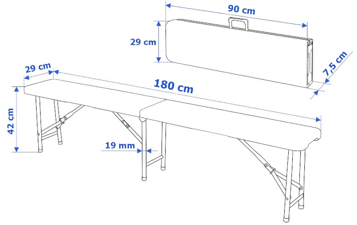 Skladacia cateringová lavica je veľmi praktická a odolná. Konštrukcia je vyrobená z ocele s práškovým nástrekom. Sedák je vyrobený z polyetylénu HDPE. Odolná voči slnečnému žiareniu. Vďaka unikátnemu dizajnu sa celá konštrukcia schováva do sedáku lavice, zaberá málo miesta a vytvára ergonomický kufrík, ktorý je ľahko prenosný.