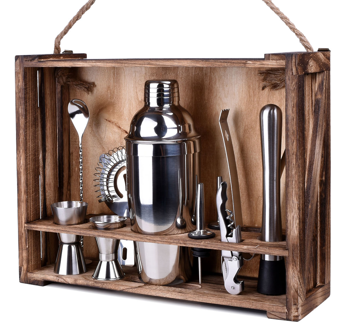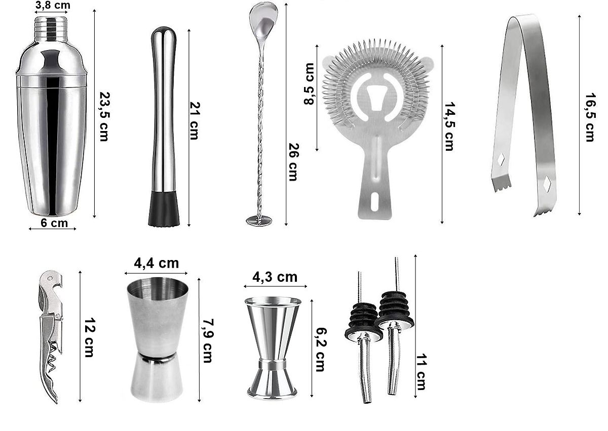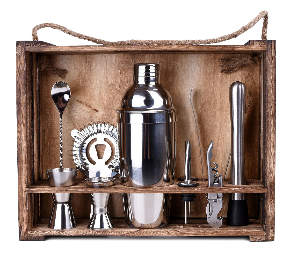 Organizujete večierok a chcete prekvapiť svojich hostí? Barmanská sada vám pomôže rozprúdiť zábavu a pripraviť originálne, zaujímavé drinky. Každý prvok sady je vyrobený z najkvalitnejšej nehrdzavejúcej ocele, vďaka čomu nemení chuť nápojov. Sada obsahuje až 11 prvkov: 10 nerezových doplnkov a stojan z borovicového dreva podrobený karbonizácii.