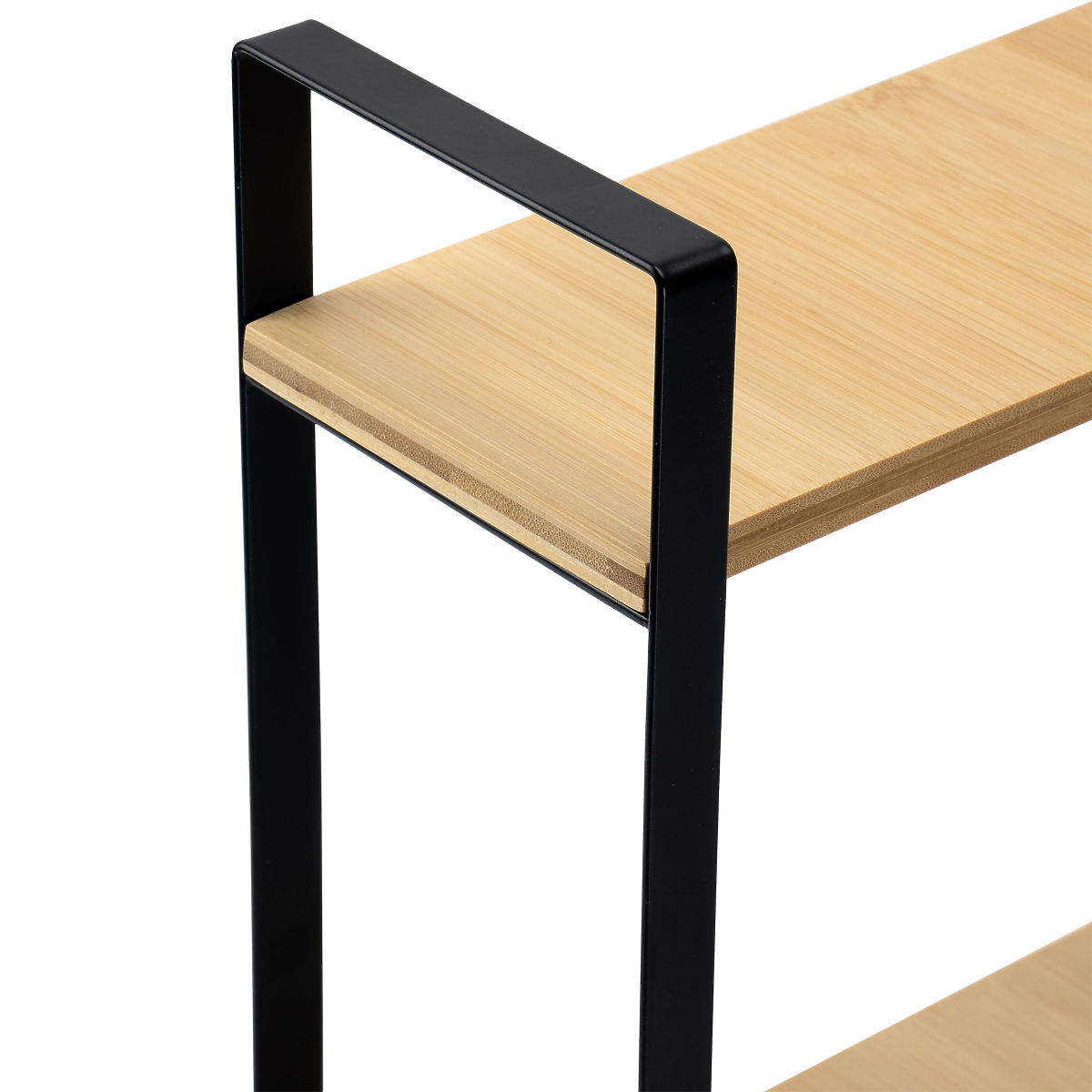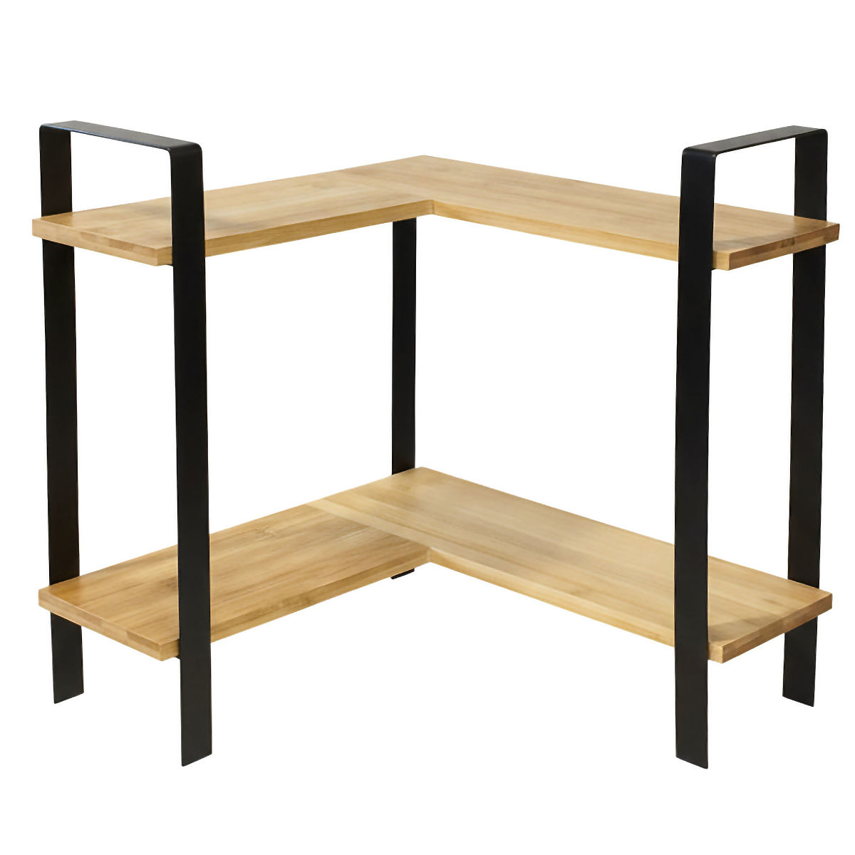 Regál Sarita je perfektným riešením pre milovníkov funkčnosti a elegancie v kuchyni. Vďaka rohovej konštrukcii efektívne využíva dostupný priestor, čo z neho robí ideálnu voľbu pre menšie priestory. Vyrobený z odolnej práškovo lakovanej ocele a prírodného bambusového dreva, vyniká výnimočnou estetikou a starostlivosťou o každý detail. Matná, čierna kovová konštrukcia dodáva regálu moderný, loftový vzhľad, a nožičky s ochrannými podložkami zabezpečujú stabilitu a ochranu povrchu, na ktorom stojí.