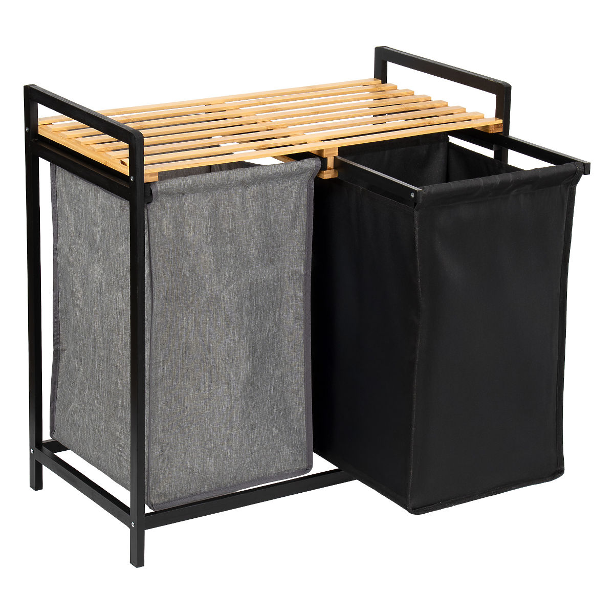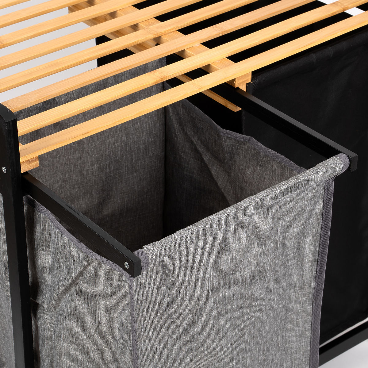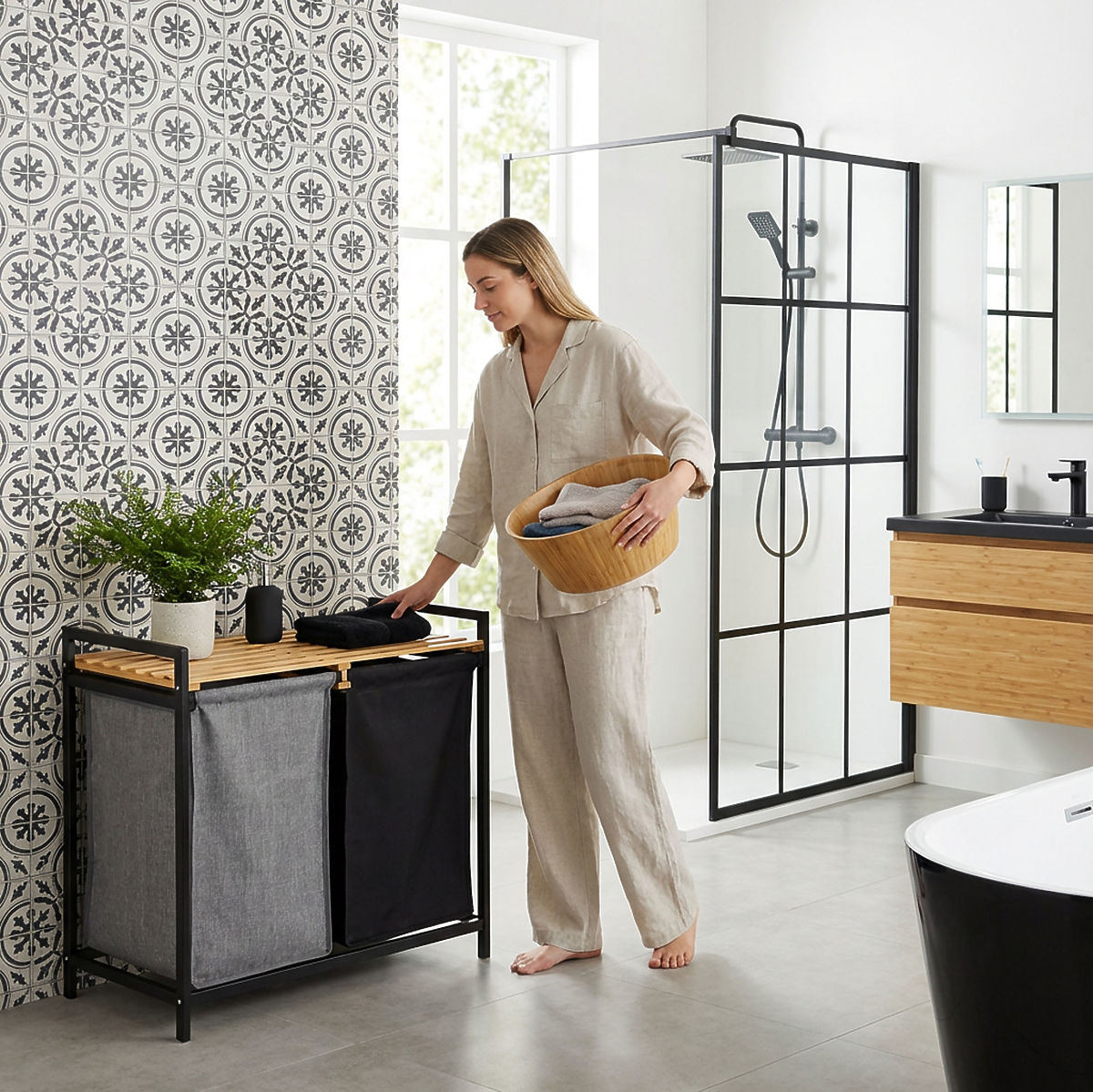 Bambusový kôš na bielizeň Hanoi Black Duo Farba je štýlové a funkčné riešenie pre modernú kúpeľňu. Kapacita 80 litrov a rozdelenie na dve komory uľahčujú triedenie bielizne. Praktická horná polica je vhodná na detergenty, doplnky alebo dekorácie. Látkové koše sa dajú ľahko vysúvať a jednoduchá montáž bez vŕtania umožňuje rýchlo pripraviť kôš na použitie. Ideálny pre loftové a moderné interiéry.