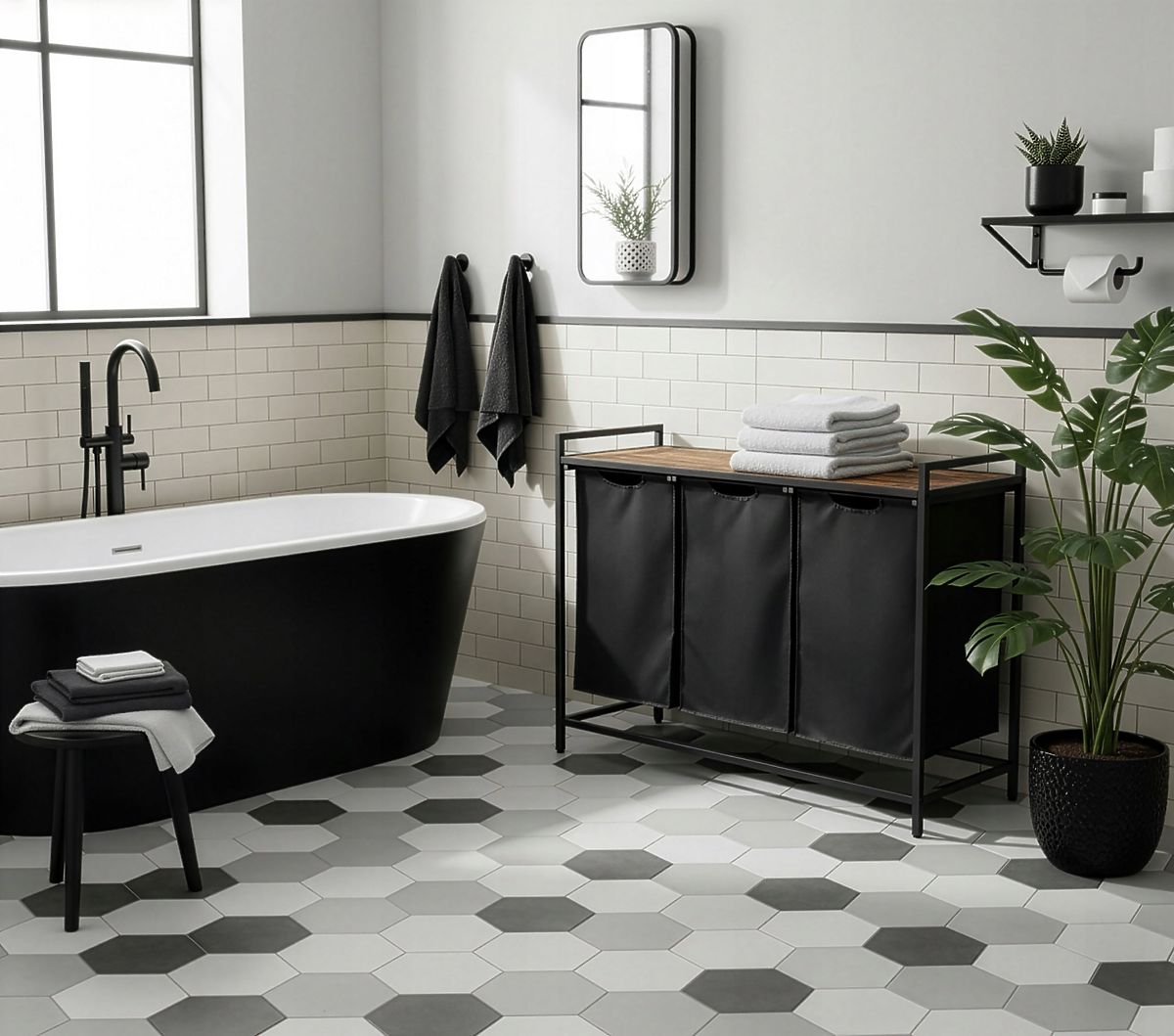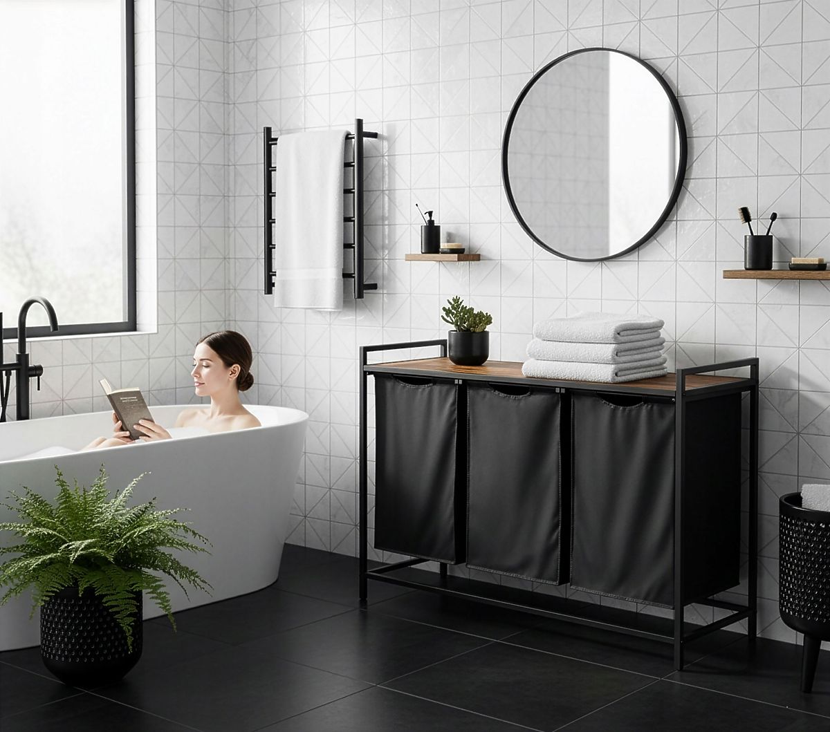 Trojkomorový kôš na bielizeň Artus je vynikajúcim riešením pre tých, ktorí si cenia poriadok a funkčnosť v kúpeľňovom priestore. Jeho loftový, industriálny dizajn sa skvele hodí do moderných interiérov, ponúkajúc maximálne pohodlie a úsporu miesta. Tri oddelené komory umožňujú presnú segregáciu bielizne, čo uľahčuje organizáciu každodenných povinností. Navyše praktická polica nad košmi je ideálnym miestom pre uteráky a kúpeľňové doplnky. S košom Artus nielen obohatíte estetiku svojej kúpeľne, ale aj zvýšite jej funkčnosť.