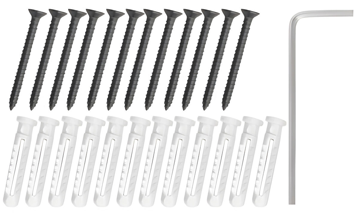 ➡️ Obsah sady: police (3 ks), oceľové profily, hmoždinky, skrutky, imbusový kľúč, návod