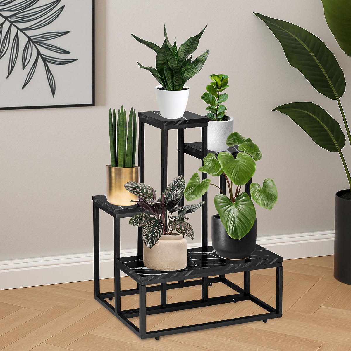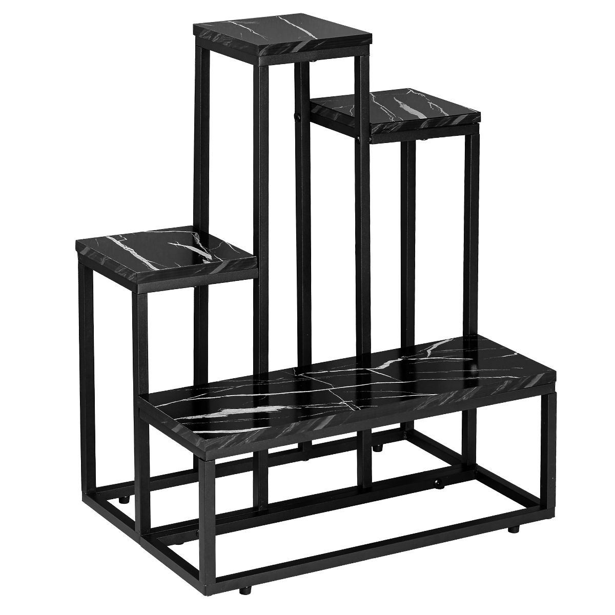 ✔️ Mramorová elegancia – laminované police vo farbe čierneho mramoru dodávajú stojanu na kvety luxusný charakter. Laminovaný povrch nielen vyzerá elegantne, ale aj krásne zvýrazňuje rastliny a dekorácie.