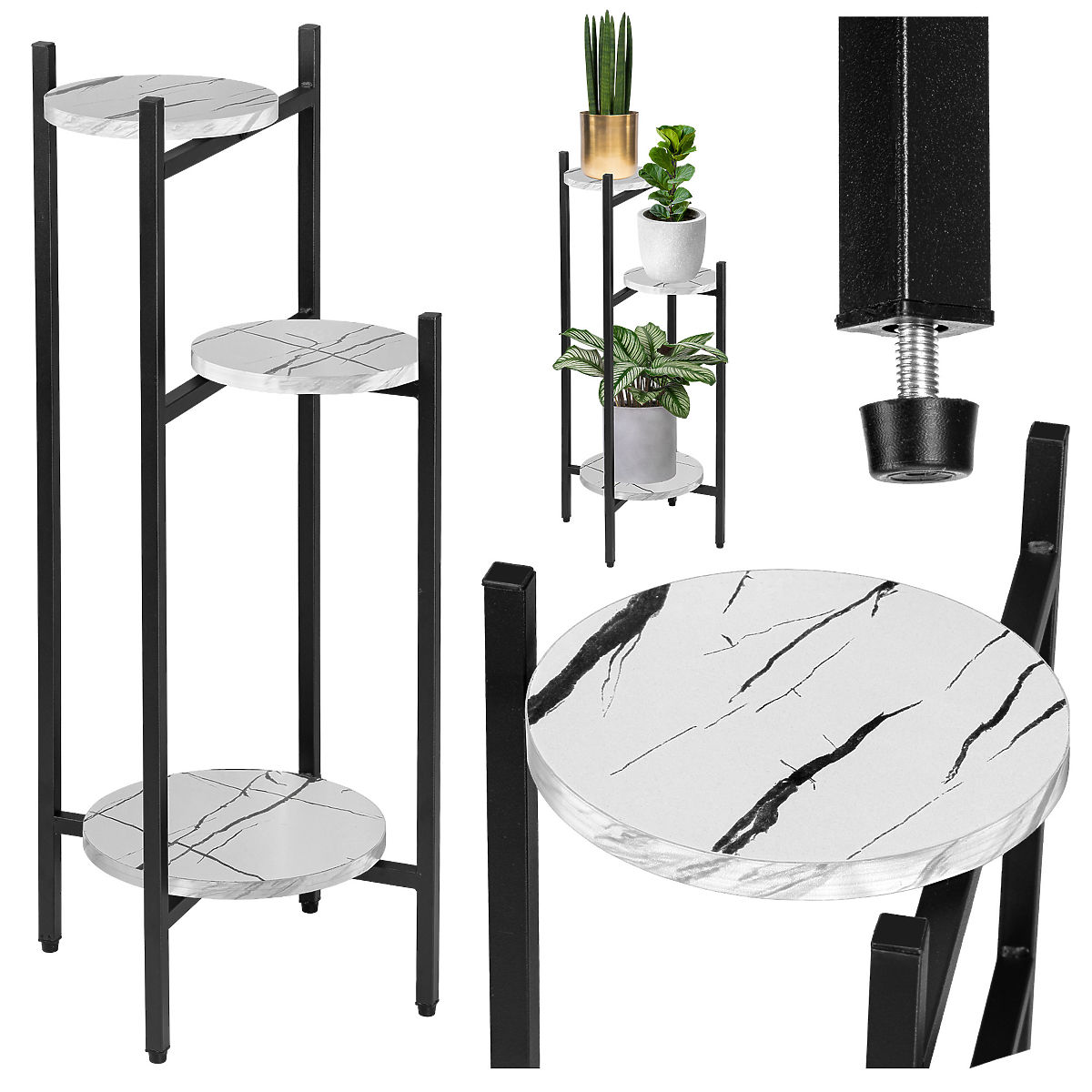 Tretorri je pevný stojan na kvety vyrobený z oceľových profilov lakovaných práškovou farbou a laminovaných dosiek imitujúcich mramor. Vyznačuje sa jednoduchým dizajnom a atraktívnym vzhľadom, ktorý sa hodí do každého moderne zariadeného interiéru v štýle loft, modernom alebo glamour. Stojan má pevnú oceľovú konštrukciu a stabilné police na kvety a dekorácie, aj tie ťažšie. Má ochranné podložky na základni s možnosťou vyrovnania. Vyrobený z najkvalitnejších materiálov s dôrazom na najmenšie detaily. Skvele sa hodí na vystavenie kvetov a ukázanie ich jedinečných vlastností. Tretorri je výnimočný stojan na kvety, s pevnou konštrukciou a zaujímavým dizajnom, ktorý nemožno prehliadnuť.