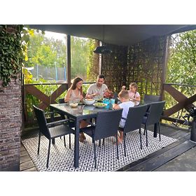 Záhradný nábytok SOTTILE je ideálnym riešením pre tých, ktorí si cenia eleganciu, pohodlie a trvanlivosť záhradného nábytku. Jedálenská súprava určená pre 8 osôb poskytuje vynikajúce podmienky na organizovanie stretnutí s blízkymi, spája neobyčajné pohodlie s jedinečným dizajnom. Každý prvok záhradnej súpravy je vyrobený z vysoko kvalitného technoratanu, čo nielen zaisťuje jeho dlhú životnosť a odolnosť voči škodlivým vplyvom počasia, ale aj umožňuje jednoduchú údržbu. Skvelá precíznosť spracovania podčiarkuje luxusný charakter nábytku, vďaka čomu sa technoratanový nábytok SOTTILE stáva nádhernou ozdobou každého vonkajšieho priestoru. Stôl so stoličkami je odolný voči dažďu a UV žiareniu, čo zaručuje, že si zachovajú svoj estetický vzhľad po mnoho rokov, stávajúc sa nepostrádateľným prvkom vybavenia každej záhrady, terasy alebo patia. Farba súpravy SOTTILE: čierna – jednoliata, jemne pruhovaná štruktúra. Pletenina: technoratan 7-8mm x 1,2mm. Konštrukcia nábytku: stôl – hliník, stoličky – oceľ. Súprava sa skladá z 9 prvkov: 1 x stôl: dĺžka: 200 cm, šírka: 100 cm, výška: 74 cm, sklenená, priehľadná doska vyrobená z 5 mm bezpečnostného skla, položená na technoratanovej pletenine. 8 x stoličky: šírka: 56 cm, hĺbka: 50 cm, výška: 84 cm, výška od podlahy k sedáku: 44 cm, výška operadla od sedáku: 43 cm, šírka sedáku: 40 cm, hĺbka sedáku: 43 cm. Súprava je zasielaná na 1 palete o rozmeroch 120x80x210 cm, váha 80 kg. Stoličky možno po vybratí z krabíc ihneď používať. Stoličky sú stohovateľné (možnosť vkladania jednej do druhej), čo uľahčuje skladovanie a nábytok nezaberá veľa miesta. Stôl je určený na jednoduchú, samostatnú montáž podľa priloženého návodu. Sklenená doska stola je upevnená na silikónových prísavkách, ktoré ju chránia pred posúvaním. Možnosť zakúpenia vankúšov na stoličky tu. Technoratan je odolný voči škodlivým vplyvom počasia, avšak pre ešte dlhšie zachovanie nemenného vzhľadu nábytku odporúčame zakúpiť ochranný kryt. Kryt v tmavo šedej farbe je jednodielny a má dole sťahovaciu šnúrku. Všetky kryty sú šité na zákazku a doba realizácie je cca 14 pracovných dní. Predstavte si záhradný nábytok, ktorý prekračuje vaše očakávania v každom ohľade – od odolnosti po dizajn. To je BELLO GIARDINO, kde každý detail má význam a luxus sa stretáva s funkčnosťou: Nepominuteľná kvalita: Náš syntetický ratan je zárukou, že nábytok vydrží roky, bez toho aby stratil na kráse či trvanlivosti. Odolnosť voči počasiu: Náš nábytok čelí najťažším poveternostným podmienkam, od spaľujúceho slnka po mrazivé zimy, zostávajúc stále krásny. Luxusné pohodlie: Silné, mäkké vankúše pozývajú k relaxácii, ponúkajú pohodlie, ktoré je ťažké nájsť inde. Ľahkosť a pevnosť: Hliníková konštrukcia spája to najlepšie z oboch svetov – je ľahká, ale mimoriadne stabilná. Dizajn, ktorý očarí: Každý prvok nášho nábytku bol navrhnutý s ohľadom na estetiku a funkčnosť, aby sa hodil do každého prostredia. Či už ste milovníkom minimalizmu, alebo si ceníte bohaté, elegantné aranžmány, náš nábytok splní vaše očakávania, prekračujúc hranice bežnej funkčnosti a estetiky. Zaisťujeme, že aj tí najodolnejší zákazníci neodolajú pohodliu a štýlu, ktorý ponúka BELLO GIARDINO. Urobte zo svojej záhrady, terasy alebo balkóna oázu relaxácie a elegancie, ktorú ste vždy chceli mať. Nečakajte, objavte BELLO GIARDINO už dnes a premeňte svoje vonkajšie priestory na miesta, o akých ste vždy snívali. Fotografie nábytku od našich zákazníkov: