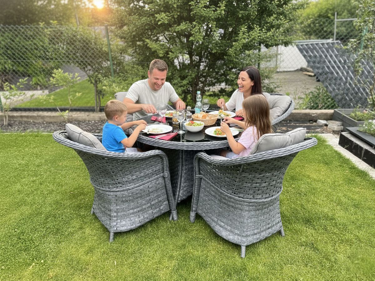 Jedálenská súprava MODERNO je kvintesenciou moderného dizajnu a inovatívneho prístupu k vybaveniu interiérov. Predstavuje neotrelý dizajn, ktorý sa odlišuje od štandardných riešení a poskytuje nielen estetiku, ale aj bezkonkurenčnú trvanlivosť vďaka použitiu vysoko kvalitného syntetického ratanu. Absolútna odolnosť voči poveternostným vplyvom robí tento set ideálnou voľbou ako pre interiéry, tak pre vonkajšie priestory. Voľbou setu MODERNO investujete do nábytku, ktorý nielen krásne vyzerá, ale je tiež prispôsobený na dlhodobé používanie, spĺňajúci očakávania najnáročnejších zákazníkov hľadajúcich jedinečné spojenie funkčnosti, trvanlivosti a súčasného štýlu. Farba setu: sivý melír, nejednotný Farba vankúšov: tmavosivá Pletenie: plochý technoratan 17 mm x 1,2 mm a okrúhly technoratan, hladká štruktúra Konštrukcia: oceľová Set zložený z 5 prvkov: 4 x kreslo: šírka: 56 cm hĺbka: 70 cm výška: 81 cm 1 x stôl (so sklenenou čiernou doskou z 5mm bezpečnostného skla): priemer: 120 cm výška: 74 cm Ďalšie rozmery: Výška sedadla kresla: 38 cm + 5 cm vankúš Výška operadla od sedadla: 50 cm Šírka podrúčok a operadla: 5 cm Šírka a hĺbka sedadla: 52 x 52 cm Set je zasielaný na 1 palete o rozmeroch 120x100x210 cm, hmotnosť 70 kg Vankúše v tmavosivej farbe na sedadlá v cene setu (4 ks) Všetky majú snímateľné poťahy na zips, vyrobené z outdoorového materiálu (100% polyester), ktoré možno prať pri nízkych teplotách. Poťahy na vankúše sú ušité z vysoko kvalitnej tkaniny pokrytej teflónom, ktorý ich chráni pred vlhkosťou. Výplň vankúšov je vyrobená z vysoko kvalitnej čalúnnickej peny (stredne tvrdé - T25), ktorá zabraňuje deformáciám. Hrúbka vankúšov: 5 cm. Možnosť ušitia vankúšov na individuálnu objednávku k tomuto setu: https://www.bg-meble.pl/pl/p/Usluga-Krawiecka-Poduszki-Na-Zamowienie-/742 Možnosť ušitia poťahov na vankúše na individuálnu objednávku k tomuto setu: https://www.bg-meble.pl/pl/p/Usluga-Krawiecka-Poszewki-Na-Zamowienie/743 Pre dlhšie zachovanie nemenného vzhľadu nábytku odporúčame zakúpiť ochranný kryt. Kryt v tmavosivej farbe je jednodielny a má na spodnej strane sťahovaciu šnúrku. Všetky kryty sú šité na zákazku a doba realizácie je cca 14 pracovných dní. Predstavte si záhradný nábytok, ktorý prekračuje vaše očakávania vo všetkých smeroch – od odolnosti po dizajn. To je BELLO GIARDINO, kde každý detail má význam a luxus sa stretáva s funkčnosťou: Nepominuteľná kvalita: Náš syntetický ratan je zárukou, že nábytok vydrží roky, bez toho aby stratil na kráse alebo trvanlivosti. Odolnosť voči počasiu: Náš nábytok čelí najťažším poveternostným podmienkam, od spaľujúceho slnka po mrazivé zimy, zostávajúc stále krásny. Luxusný komfort: Silné, mäkké vankúše pozývajú k relaxácii, ponúkajúc komfort, ktorý je ťažké nájsť inde. Ľahkosť a pevnosť: Hliníková konštrukcia spája to najlepšie z oboch svetov – je ľahká, ale mimoriadne stabilná. Dizajn, ktorý očarí: Každý prvok nášho nábytku bol navrhnutý s ohľadom na estetiku a funkčnosť, aby sa hodil do každého prostredia. Či už ste milovníkom minimalizmu, alebo si ceníte bohatých, elegantných aranžmánov, náš nábytok splní vaše očakávania, prekračujúce hranice obyčajnej funkčnosti a estetiky. Zaručujeme, že aj tí najodolnejší zákazníci nebudú môcť odolať pohodliu a štýlu, ktorý ponúka BELLO GIARDINO. Urobte zo svojej záhrady, terasy alebo balkóna oázu relaxácie a elegancie, ktorú ste vždy chceli mať. Nečakajte, objavte BELLO GIARDINO už dnes a premeňte svoje vonkajšie priestory na miesta, o ktorých ste vždy snívali. Fotografie od našich zákazníkov