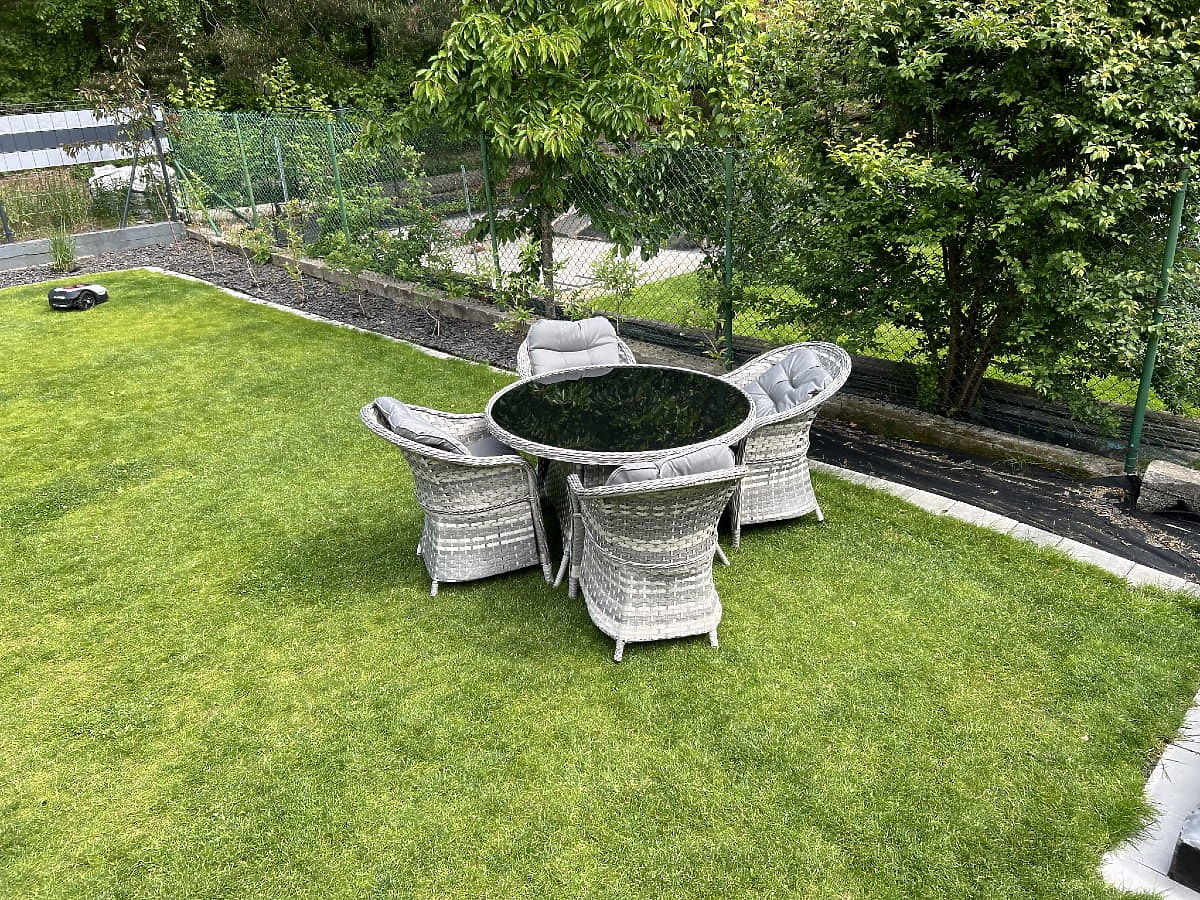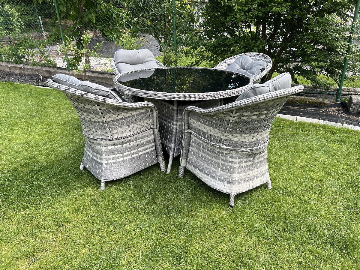 Súprava stolového nábytku MODERNO je synonymom modernosti a elegancie v usporiadaní priestoru. Vyznačuje sa neobvyklým dizajnom, ktorý sa hodí do najmodernejších trendov v dizajne a zároveň ponúka výnimočnú trvanlivosť a odolnosť vďaka použitiu najkvalitnejšieho syntetického ratanu. Kreslá a stôl z tejto kolekcie sú úplne odolné voči škodlivým vplyvom počasia, čo robí súpravu MODERNO skvelou voľbou ako pre vnútorné, tak pre vonkajšie použitie. Táto výnimočná súprava nábytku bola navrhnutá s ohľadom na najnáročnejších zákazníkov, ktorí hľadajú kombináciu funkčnosti, trvanlivosti a moderného dizajnu. Farba súpravy: svetlosivý melír, nejednotná Farba vankúšov: tmavosivá Pletenina: plochý technoratan 17mm x 1,2mm a okrúhly technoratan, hladká štruktúra Konštrukcia: oceľová Súprava sa skladá z 5 prvkov: 4 x kreslo: šírka: 56 cm hĺbka: 70 cm výška: 81 cm 1 x stôl (so sklenenou čiernou doskou z 5mm bezpečnostného skla): priemer: 120 cm výška: 74 cm Ďalšie rozmery: Výška sedadla kresla: 38 cm + 5 cm vankúš Výška operadla od sedadla: 50 cm Šírka podrúčok a operadla: 5 cm Šírka a hĺbka sedadla: 52 x 52 cm Súprava je zasielaná na 1 palete o rozmeroch 120x100x210 cm, hmotnosť 70 kg Vankúše v tmavosivej farbe na sedadlá v cene súpravy (4 ks) Všetky majú odnímateľné poťahy na zips, vyrobené z outdoorového materiálu (100% polyester), ktoré možno prať pri nízkych teplotách. Poťahy na vankúše sú ušité z vysoko kvalitnej tkaniny potiahnutej teflónom, ktorý ich chráni pred vlhkosťou. Výplň vankúšov je vyrobená z vysoko kvalitnej čalúnnickej peny (stredne tvrdá - T25), ktorá zabraňuje deformáciám. Hrúbka vankúšov: 5 cm. Možnosť ušitia vankúšov na zákazku pre túto súpravu: https://www.bg-meble.pl/pl/p/Usluga-Krawiecka-Poduszki-Na-Zamowienie-/742 Možnosť ušitia poťahov na vankúše na zákazku pre túto súpravu: https://www.bg-meble.pl/pl/p/Usluga-Krawiecka-Poszewki-Na-Zamowienie/743 Aby si nábytok udržal svoj vzhľad čo najdlhšie, odporúčame zakúpiť ochranný kryt. Kryt v tmavosivej farbe je jednodielny a má dole sťahovaciu šnúrku. Všetky kryty sú šité na zákazku a doba realizácie je cca 14 pracovných dní. Predstavte si záhradný nábytok, ktorý prekoná vaše očakávania vo všetkých ohľadoch – od odolnosti po dizajn. To je BELLO GIARDINO, kde každý detail má význam a luxus sa stretáva s funkčnosťou: Nepominuteľná kvalita: Náš syntetický ratan je zárukou, že nábytok vydrží roky, bez toho aby stratil na kráse či trvanlivosti. Odolnosť voči počasiu: Náš nábytok čelí najťažším poveternostným podmienkam, od spaľujúceho slnka po mrazivé zimy, zostávajúc stále krásny. Luxusný komfort: Silné, mäkké vankúše pozývajú k relaxácii, ponúkajúc komfort, ktorý je ťažké nájsť inde. Ľahkosť a pevnosť: Hliníková konštrukcia spája to najlepšie z oboch svetov – je ľahká, ale mimoriadne stabilná. Dizajn, ktorý očarí: Každý prvok nášho nábytku bol navrhnutý s ohľadom na estetiku a funkčnosť, aby sa hodil do každého prostredia. Či už ste milovníkom minimalizmu, alebo si ceníte bohatých, elegantných aranžmánov, náš nábytok splní vaše očakávania, prekračujúc hranice bežnej funkčnosti a estetiky. Zaručujeme, že aj tí najodolnejší zákazníci neodolajú pohodliu a štýlu, ktorý ponúka BELLO GIARDINO. Urobte zo svojej záhrady, terasy alebo balkóna oázu relaxácie a elegancie, ktorú ste vždy chceli mať. Nečakajte, objavte BELLO GIARDINO ešte dnes a premeňte svoje vonkajšie priestory na miesta, o ktorých ste vždy snívali. Fotografie od našich zákazníkov