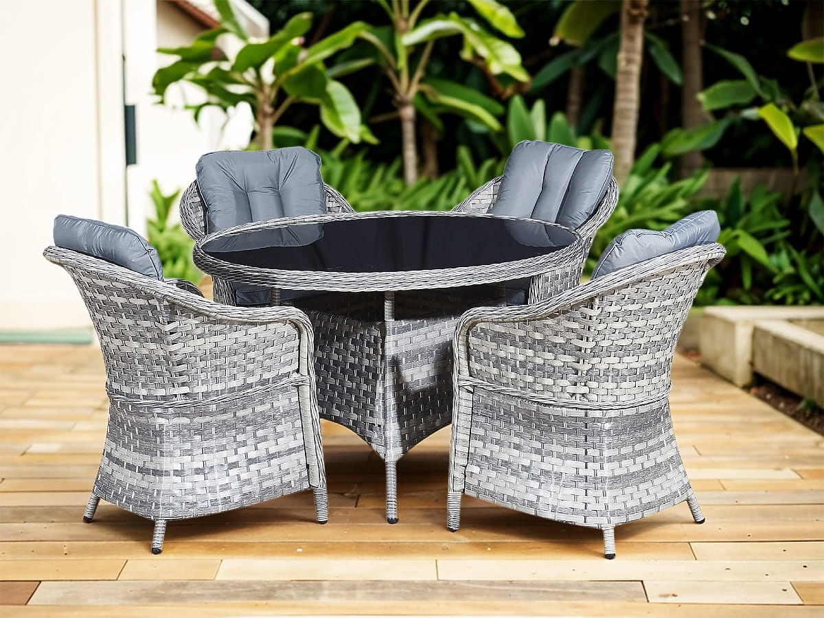 Súprava stolového nábytku z technoratanu (4 kreslá + okrúhly stôl) MODERNO svetlosivá