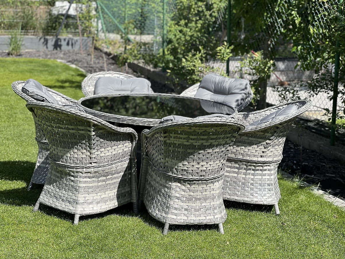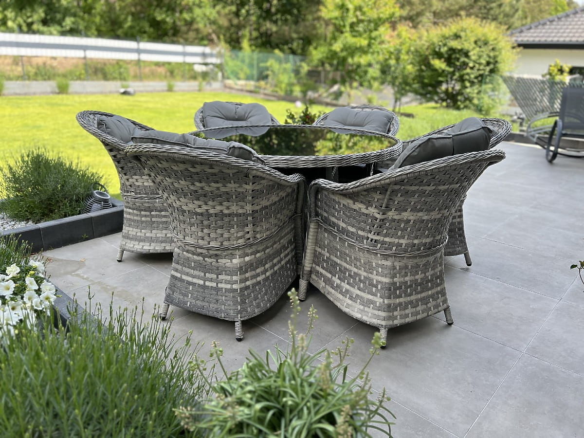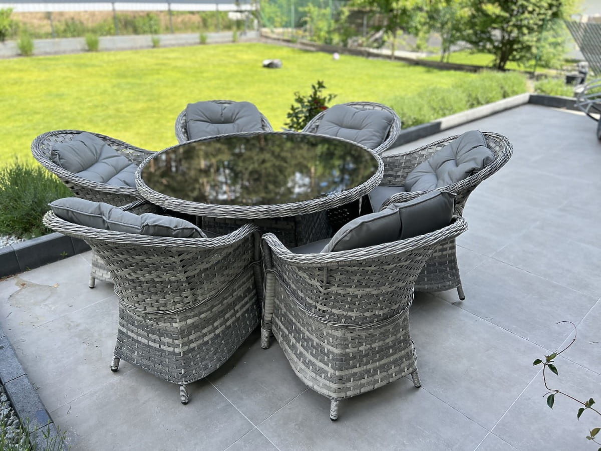 Súprava jedálenského nábytku MODERNO je esenciou moderného dizajnu a inovácie v oblasti vonkajšieho a vnútorného nábytku. Ponúka jedinečné spojenie najnovšieho dizajnu s funkčnosťou, táto súprava sa stáva srdcom každého priestoru. Kreslá a stôl z tejto kolekcie sú vyrobené z vysoko kvalitného syntetického ratanu, čo zaisťuje absolútnu odolnosť voči škodlivým vplyvom počasia, čo garantuje ich dlhú životnosť a trvanlivosť. Výber materiálov najvyššej triedy robí MODERNO GRANDE ideálnym pre najnáročnejších zákazníkov, ktorí hľadajú nielen krásu, ale aj praktickosť a odolnosť vo svojom jedálenskom nábytku. Táto súprava je ideálnym riešením pre tých, ktorí chcú spojiť eleganciu s modernosťou vo svojom životnom priestore. Farba súpravy: svetlosivý melír, nejednotný Farba vankúšov: tmavosivá Výplet: plochý technoratan 17mm x 1,2mm a guľatý technoratan, hladká štruktúra Konštrukcia: oceľová Súprava sa skladá zo 7 prvkov: 6 x kreslo: šírka: 56 cm hĺbka: 70 cm výška: 81 cm 1 x stôl (so sklenenou čiernou doskou z 5mm bezpečnostného skla): priemer: 120 cm výška: 74 cm Ďalšie rozmery: Výška sedadla kresla: 38 cm + 5 cm vankúš Výška operadla od sedadla: 50 cm Šírka podrúčok a operadla: 5 cm Šírka a hĺbka sedadla: 52 x 52 cm Súprava je zasielaná na 1 palete o rozmeroch 145x125x210 cm, váha 90 kg Vankúše v tmavosivej farbe na sedadlá v cene súpravy (6 ks) Všetky majú snímateľné poťahy na zips, vyrobené z outdoorového materiálu (100% polyester), ktoré možno prať pri nízkych teplotách. Poťahy na vankúše sú ušité z vysoko kvalitnej tkaniny potiahnutej teflónom, ktorý ich chráni pred vlhkosťou. Výplň vankúšov je vyrobená z vysoko kvalitnej čalúnickej peny (stredne tvrdá - T25), ktorá zabraňuje deformáciám. Hrúbka vankúšov: 5 cm. Možnosť ušitia vankúšov na individuálnu objednávku k tejto súprave: https://www.bg-meble.pl/pl/p/Usluga-Krawiecka-Poduszki-Na-Zamowienie-/742 Možnosť ušitia poťahov na vankúše na individuálnu objednávku k tejto súprave: https://www.bg-meble.pl/pl/p/Usluga-Krawiecka-Poszewki-Na-Zamowienie/743 Pre ešte dlhšie zachovanie nezmeneného vzhľadu nábytku odporúčame zakúpiť ochranný kryt. Kryt v tmavosivej farbe je jednodielny a má dole sťahovaciu šnúrku. Všetky kryty sú šité na objednávku a doba realizácie je cca 14 pracovných dní. Predstavte si záhradný nábytok, ktorý prekračuje vaše očakávania vo všetkých smeroch – od odolnosti po dizajn. Tu je BELLO GIARDINO, kde každý detail má význam a luxus sa stretáva s funkčnosťou: Nezmeniteľná kvalita: Náš syntetický ratan je zárukou, že nábytok vydrží roky, bez toho aby stratil na kráse či trvanlivosti. Odolnosť voči počasiu: Náš nábytok čelí najťažším poveternostným podmienkam, od spaľujúceho slnka po mrazivé zimy, zostávajúci stále krásny. Luxusný komfort: Silné, mäkké vankúše pozývajú k relaxácii, ponúkajúci komfort, ktorý je ťažké nájsť inde. Ľahkosť a odolnosť: Hliníková konštrukcia spája to najlepšie z oboch svetov – je ľahká, ale mimoriadne stabilná. Dizajn, ktorý očarí: Každý prvok nášho nábytku bol navrhnutý s ohľadom na estetiku a funkčnosť, aby sa hodil do každého prostredia. Či už ste milovníkom minimalizmu, alebo si ceníte bohatých, elegantných aranžmánov, náš nábytok splní vaše očakávania, prekračujúce hranice bežnej funkčnosti a estetiky. Zaisťujeme, že aj tí najodolnejší zákazníci neodolajú pohodliu a štýlu, ktorý ponúka BELLO GIARDINO. Urobte zo svojej záhrady, terasy alebo balkóna oázu relaxácie a elegancie, ktorú ste vždy chceli mať. Nečakajte, objavte BELLO GIARDINO ešte dnes a premeňte svoje vonkajšie priestory na miesta, o ktorých ste vždy snívali.