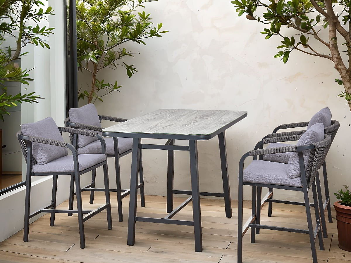 Súprava záhradného nábytku (4 barové stoličky + vysoký stôl) BREZZA sivá