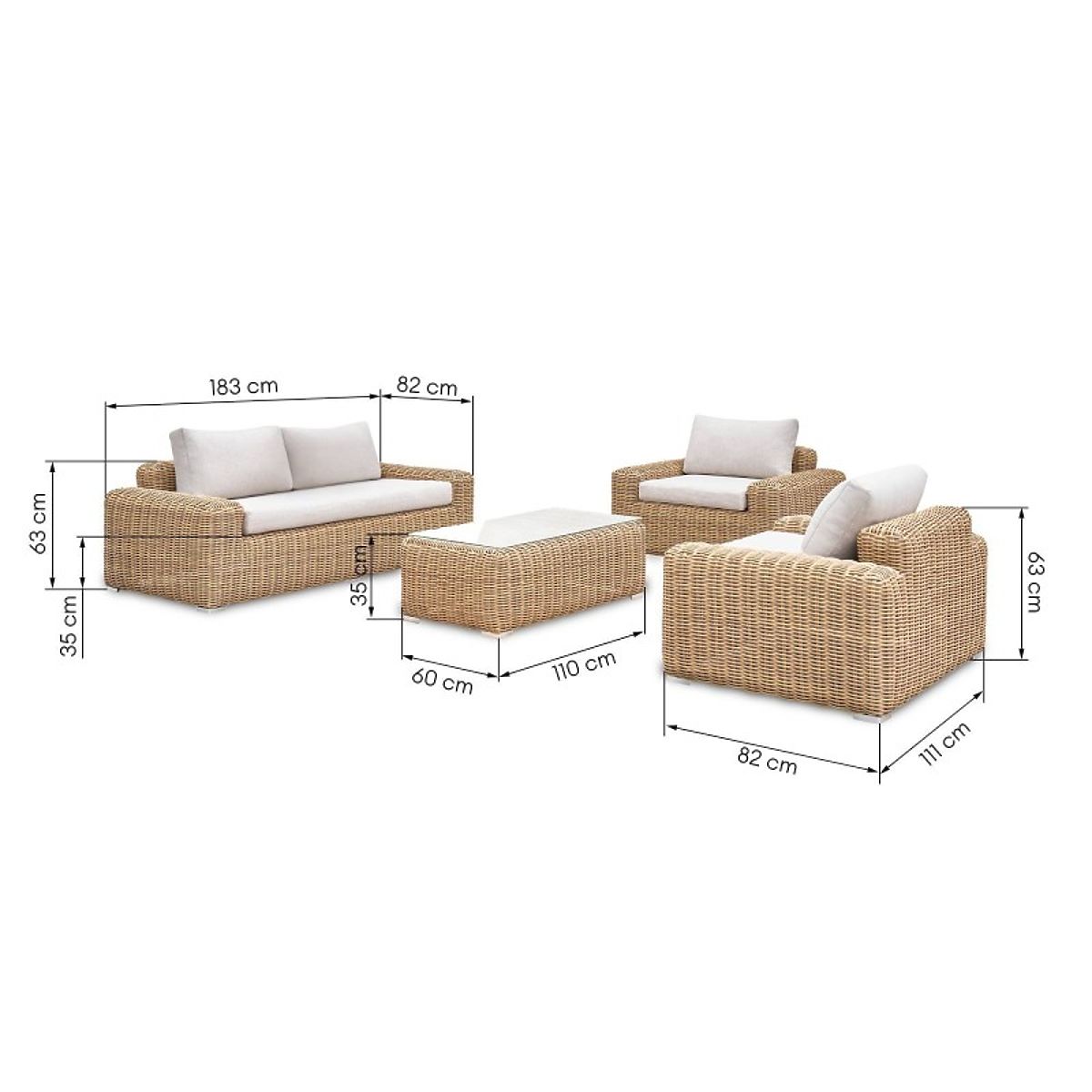 Záhradná nábytková súprava Sandy je štýlová kombinácia, pozostávajúca z priestrannej pohovky, dvoch kresiel a konferenčného stolíka, poskytujúca pohodlie a eleganciu v každom vonkajšom priestore. Vyrobená z vysoko kvalitného syntetického ratanu, spája moderný dizajn s funkčnosťou a ponúka komfortný odpočinok vďaka mäkkým vankúšom.